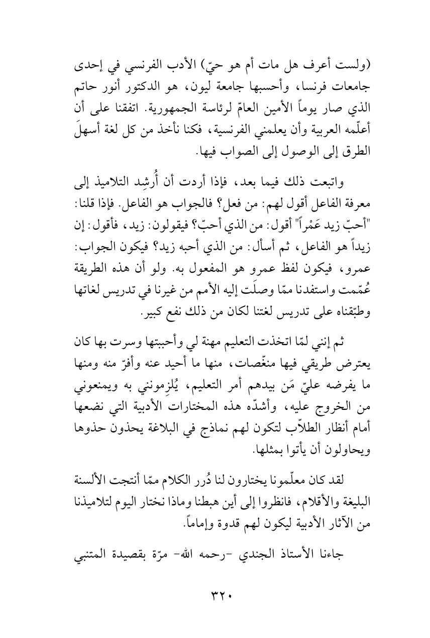 واتبعت ذلك فيما بعد، فإذا أردت أن أُرشِد التلاميذ إلى معرفة الفاعل أقول لهم: من فعل؟ فالجواب هو الفاعل. فإذا قلنا: "أحبّ زيد عَمْراً" أقول: من الذي أحبّ؟ فيقولون: زيد، فأقول: إن زيداً هو الفاعل، ثم أسأل: من الذي أحبه زيد؟ فيكون الجواب: عمرو، فيكون لفظ عمرو هو المفعول به. ولو أن هذه الطريقة عُمّمت واستفدنا ممّا وصلَت إليه الأمم من غيرنا في تدريس لغاتها وطبّقناه على تدريس لغتنا لكان من ذلك نفع كبير.