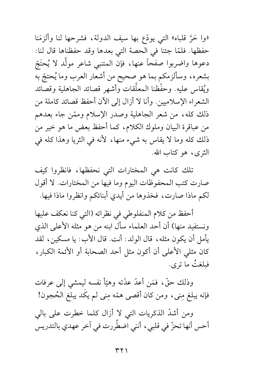 «وا حَرَّ قلباه» التي يودّع بها سيف الدولة، فشرحها لنا وألزمَنا حفظها. فلمّا جئنا في الحصة التي بعدها وقد حفظناها قال لنا: دعوها واضربوا صفحاً عنها، فإن المتنبي شاعر مولَّد لا يُحتَجّ بشعره، وسألزمكم بما هو صحيح من أشعار العرب وما يُحتجّ به ويُقاس عليه. وحفّظنا المعلَّقات وأشهر قصائد الجاهلية وقصائد الشعراء الإسلاميين. وأنا لا أزال إلى الآن أحفظ قصائد كاملة من ذلك كله، من شعر الجاهلية وصدر الإسلام وممّن جاء بعدهم من عباقرة البيان وملوك الكلام، كما أحفظ بعض ما هو خير من ذلك كله وما لا يقاس به شيء منها، لأنه في الثريا وهذا كله في الثرى، هو كتاب الله.