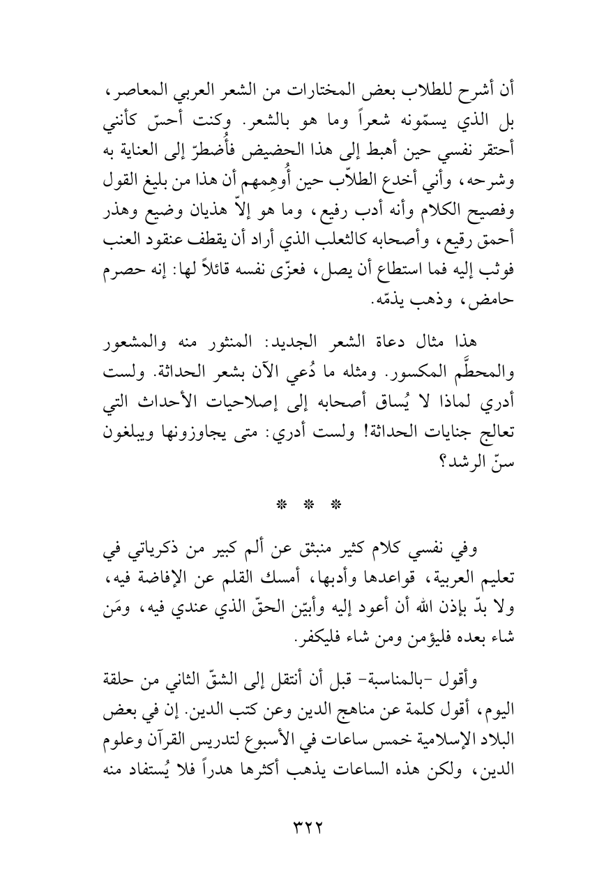 أن أشرح للطلاب بعض المختارات من الشعر العربي المعاصر، بل الذي يسمّونه شعراً وما هو بالشعر. وكنت أحسّ كأنني أحتقر نفسي حين أهبط إلى هذا الحضيض فأُضطرّ إلى العناية به وشرحه، وأني أخدع الطلاّب حين أُوهِمهم أن هذا من بليغ القول وفصيح الكلام وأنه أدب رفيع، وما هو إلاّ هذيان وضيع وهذر أحمق رقيع، وأصحابه كالثعلب الذي أراد أن يقطف عنقود العنب فوثب إليه فما استطاع أن يصل، فعزّى نفسه قائلاً لها: إنه حصرم حامض، وذهب يذمّه.