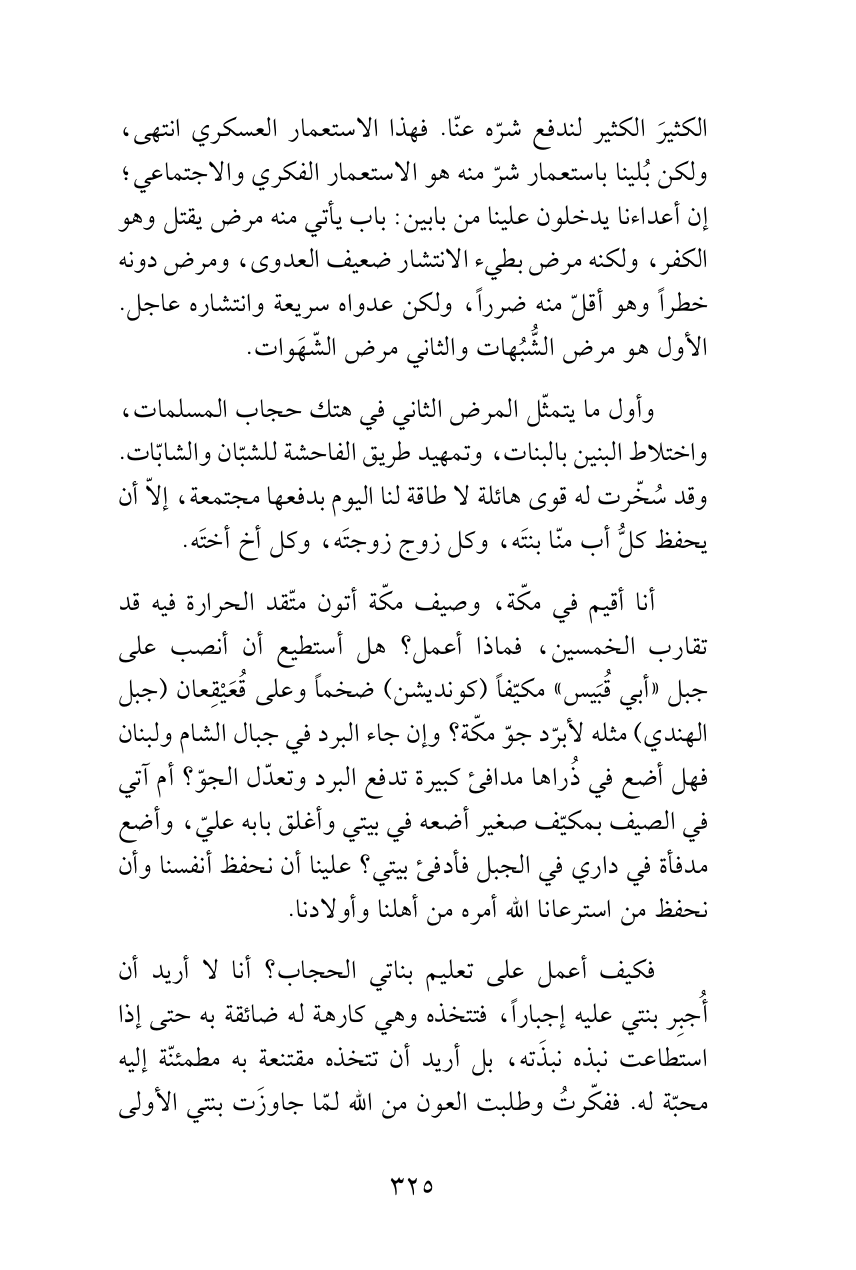 الكثيرَ الكثير لندفع شرّه عنّا. فهذا الاستعمار العسكري انتهى، ولكن بُلينا باستعمار شرّ منه هو الاستعمار الفكري والاجتماعي؛ إن أعداءنا يدخلون علينا من بابين: باب يأتي منه مرض يقتل وهو الكفر، ولكنه مرض بطيء الانتشار ضعيف العدوى، ومرض دونه خطراً وهو أقلّ منه ضرراً، ولكن عدواه سريعة وانتشاره عاجل. الأول هو مرض الشُّبُهات والثاني مرض الشّهَوات.