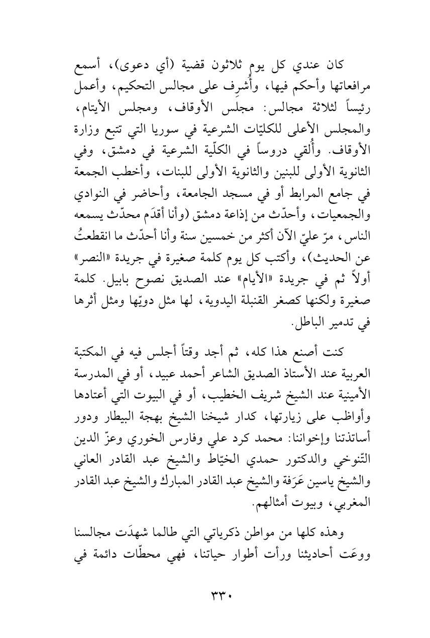 كان عندي كل يوم ثلاثون قضية (أي دعوى)، أسمع مرافعاتها وأحكم فيها، وأُشرِف على مجالس التحكيم، وأعمل رئيساً لثلاثة مجالس: مجلس الأوقاف، ومجلس الأيتام، والمجلس الأعلى للكليّات الشرعية في سوريا التي تتبع وزارة الأوقاف. وأُلقي دروساً في الكلّية الشرعية في دمشق، وفي الثانوية الأولى للبنين والثانوية الأولى للبنات، وأخطب الجمعة في جامع المرابط أو في مسجد الجامعة، وأحاضر في النوادي والجمعيات، وأحدّث من إذاعة دمشق (وأنا أقدَم محدّث يسمعه الناس، مرّ عليّ الآن أكثر من خمسين سنة وأنا أحدّث ما انقطعتُ عن الحديث)، وأكتب كل يوم كلمة صغيرة في جريدة «النصر» أولاً ثم في جريدة «الأيام» عند الصديق نصوح بابيل. كلمة صغيرة ولكنها كصغر القنبلة اليدوية، لها مثل دويّها ومثل أثرها في تدمير الباطل.