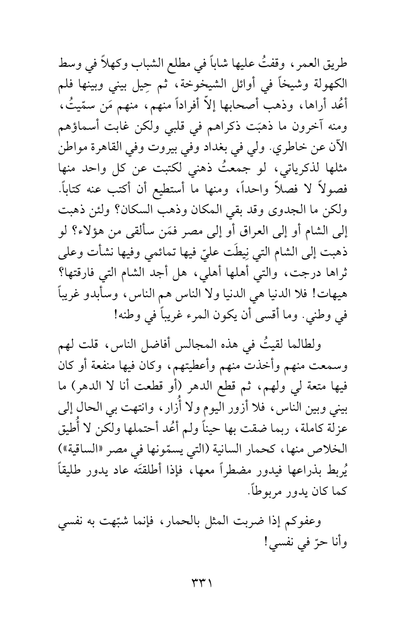 طريق العمر، وقفتُ عليها شاباً في مطلع الشباب وكهلاً في وسط الكهولة وشيخاً في أوائل الشيخوخة، ثم حِيل بيني وبينها فلم أعُد أراها، وذهب أصحابها إلاّ أفراداً منهم، منهم مَن سمّيتُ، ومنه آخرون ما ذهبَت ذكراهم في قلبي ولكن غابت أسماؤهم الآن عن خاطري. ولي في بغداد وفي بيروت وفي القاهرة مواطن مثلها لذكرياتي، لو جمعتُ ذهني لكتبت عن كل واحد منها فصولاً لا فصلاً واحداً، ومنها ما أستطيع أن أكتب عنه كتاباً. ولكن ما الجدوى وقد بقي المكان وذهب السكان؟ ولئن ذهبت إلى الشام أو إلى العراق أو إلى مصر فمَن سألقى من هؤلاء؟ لو ذهبت إلى الشام التي نِيطَت عليّ فيها تمائمي وفيها نشأت وعلى ثراها درجت، والتي أهلها أهلي، هل أجد الشام التي فارقتها؟ هيهات! فلا الدنيا هي الدنيا ولا الناس هم الناس، وسأبدو غريباً في وطني. وما أقسى أن يكون المرء غريباً في وطنه!
