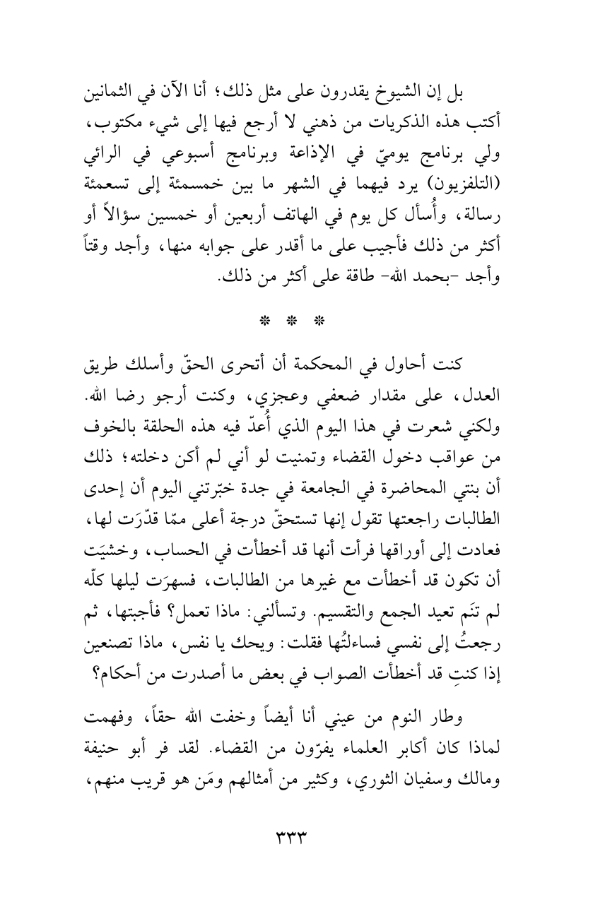 كنت أحاول في المحكمة أن أتحرى الحقّ وأسلك طريق العدل، على مقدار ضعفي وعجزي، وكنت أرجو رضا الله. ولكني شعرت في هذا اليوم الذي أُعدّ فيه هذه الحلقة بالخوف من عواقب دخول القضاء وتمنيت لو أني لم أكن دخلته؛ ذلك أن بنتي المحاضرة في الجامعة في جدة خبّرتني اليوم أن إحدى الطالبات راجعتها تقول إنها تستحقّ درجة أعلى ممّا قدّرَت لها، فعادت إلى أوراقها فرأت أنها قد أخطأت في الحساب، وخشيَت أن تكون قد أخطأت مع غيرها من الطالبات، فسهرَت ليلها كلّه لم تنَم تعيد الجمع والتقسيم. وتسألني: ماذا تعمل؟ فأجبتها، ثم رجعتُ إلى نفسي فساءلتُها فقلت: ويحك يا نفس، ماذا تصنعين إذا كنتِ قد أخطأت الصواب في بعض ما أصدرت من أحكام؟
