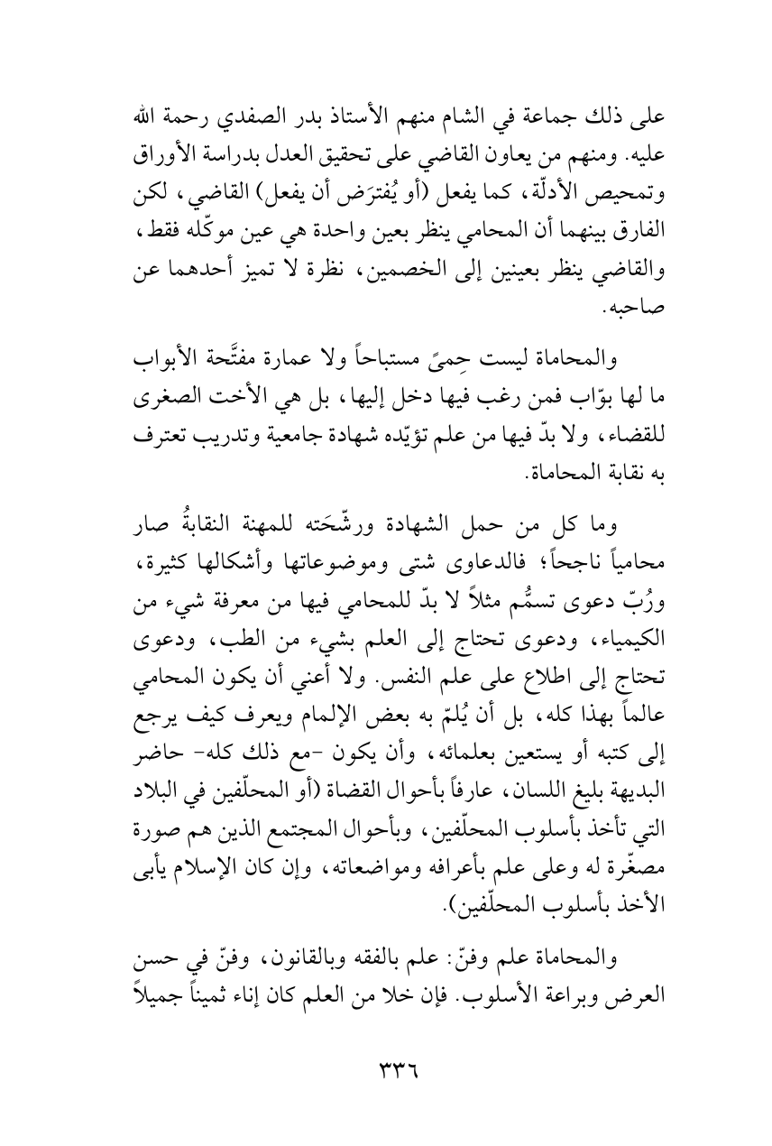 على ذلك جماعة في الشام منهم الأستاذ بدر الصفدي رحمة الله عليه. ومنهم من يعاون القاضي على تحقيق العدل بدراسة الأوراق وتمحيص الأدلّة، كما يفعل (أو يُفترَض أن يفعل) القاضي، لكن الفارق بينهما أن المحامي ينظر بعين واحدة هي عين موكّله فقط، والقاضي ينظر بعينين إلى الخصمين، نظرة لا تميز أحدهما عن صاحبه.
