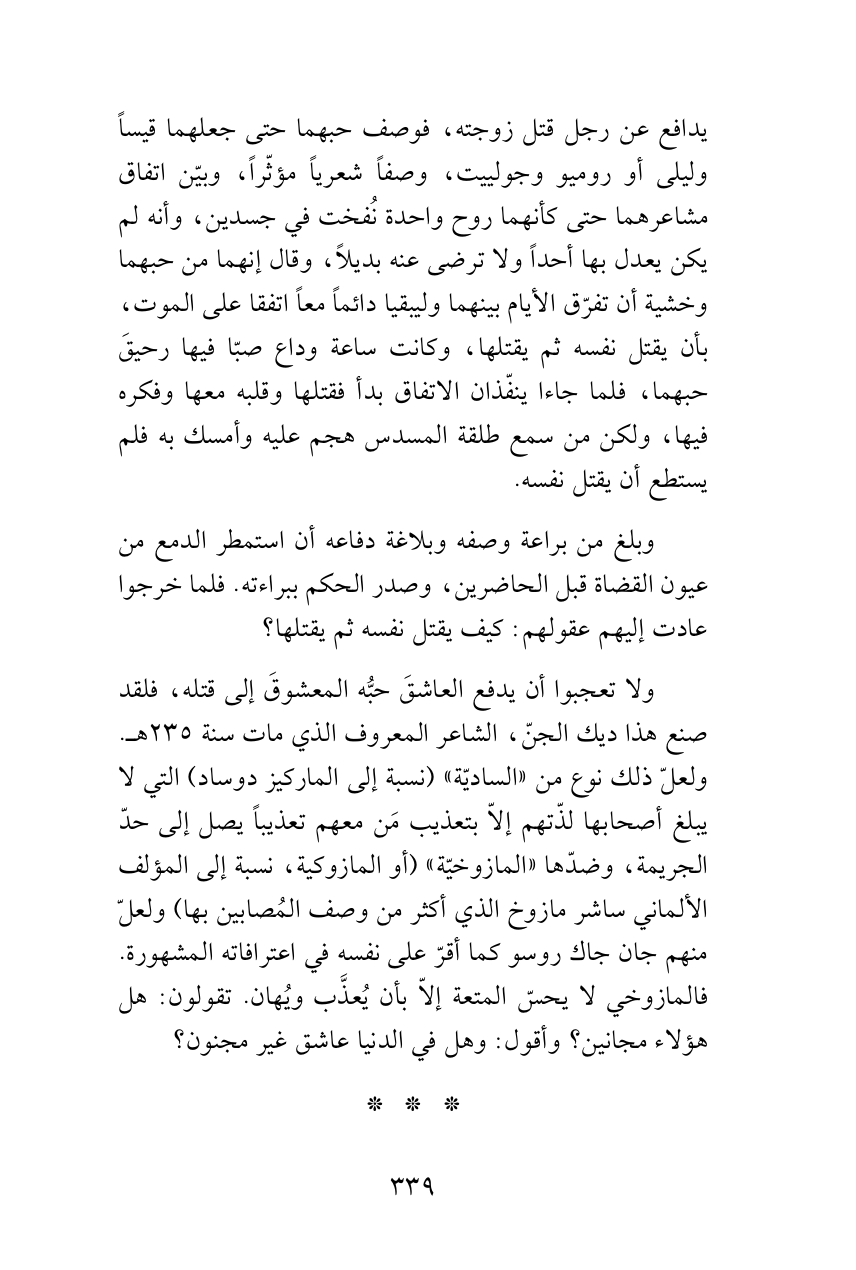 ولا تعجبوا أن يدفع العاشقَ حبُّه المعشوقَ إلى قتله، فلقد صنع هذا ديك الجنّ، الشاعر المعروف الذي مات سنة 235هـ. ولعلّ ذلك نوع من «الساديّة» (نسبة إلى الماركيز دوساد) التي لا يبلغ أصحابها لذّتهم إلاّ بتعذيب مَن معهم تعذيباً يصل إلى حدّ الجريمة، وضدّها «المازوخيّة» (أو المازوكية، نسبة إلى المؤلف الألماني ساشر مازوخ الذي أكثر من وصف المُصابين بها) ولعلّ منهم جان جاك روسو كما أقرّ على نفسه في اعترافاته المشهورة. فالمازوخي لا يحسّ المتعة إلاّ بأن يُعذَّب ويُهان. تقولون: هل هؤلاء مجانين؟ وأقول: وهل في الدنيا عاشق غير مجنون؟