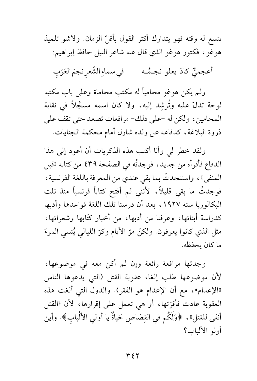 ولقد خطر لي وأنا أكتب هذه الذكريات أن أعود إلى هذا الدفاع فأقرأه من جديد، فوجدتُه في الصفحة 439 من كتابه «قبل المنفى»، واستنجدتُ بما بقي عندي من المعرفة باللغة الفرنسية، فوجدتُ ما بقي قليلاً، لأنني لم أفتح كتاباً فرنسياً منذ نلت البكالوريا سنة 1927، بعد أن درسنا تلك اللغة قواعدها وأدبها كدراسة أبنائها، وعرفنا من أدبها، من أخبار كتّابها وشعرائها، مثل الذي كانوا يعرفون. ولكنّ مرّ الأيام وكرّ الليالي يُنسي المرءَ ما كان يحفظه.