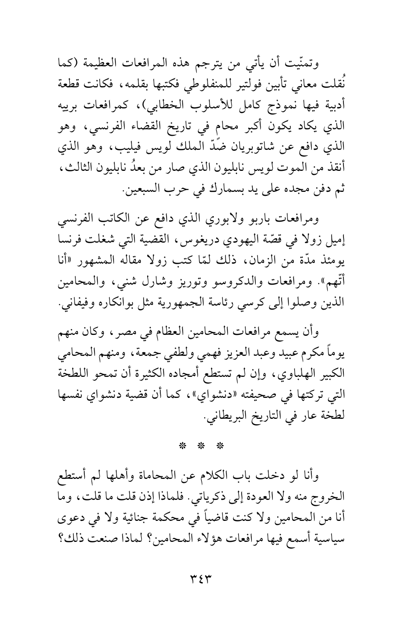 وتمنّيت أن يأتي من يترجم هذه المرافعات العظيمة (كما نُقلت معاني تأبين فولتير للمنفلوطي فكتبها بقلمه، فكانت قطعة أدبية فيها نموذج كامل للأسلوب الخطابي)، كمرافعات برييه الذي يكاد يكون أكبر محامٍ في تاريخ القضاء الفرنسي، وهو الذي دافع عن شاتوبريان ضدّ الملك لويس فيليب، وهو الذي أنقذ من الموت لويس نابليون الذي صار من بعدُ نابليون الثالث، ثم دفن مجده على يد بسمارك في حرب السبعين.