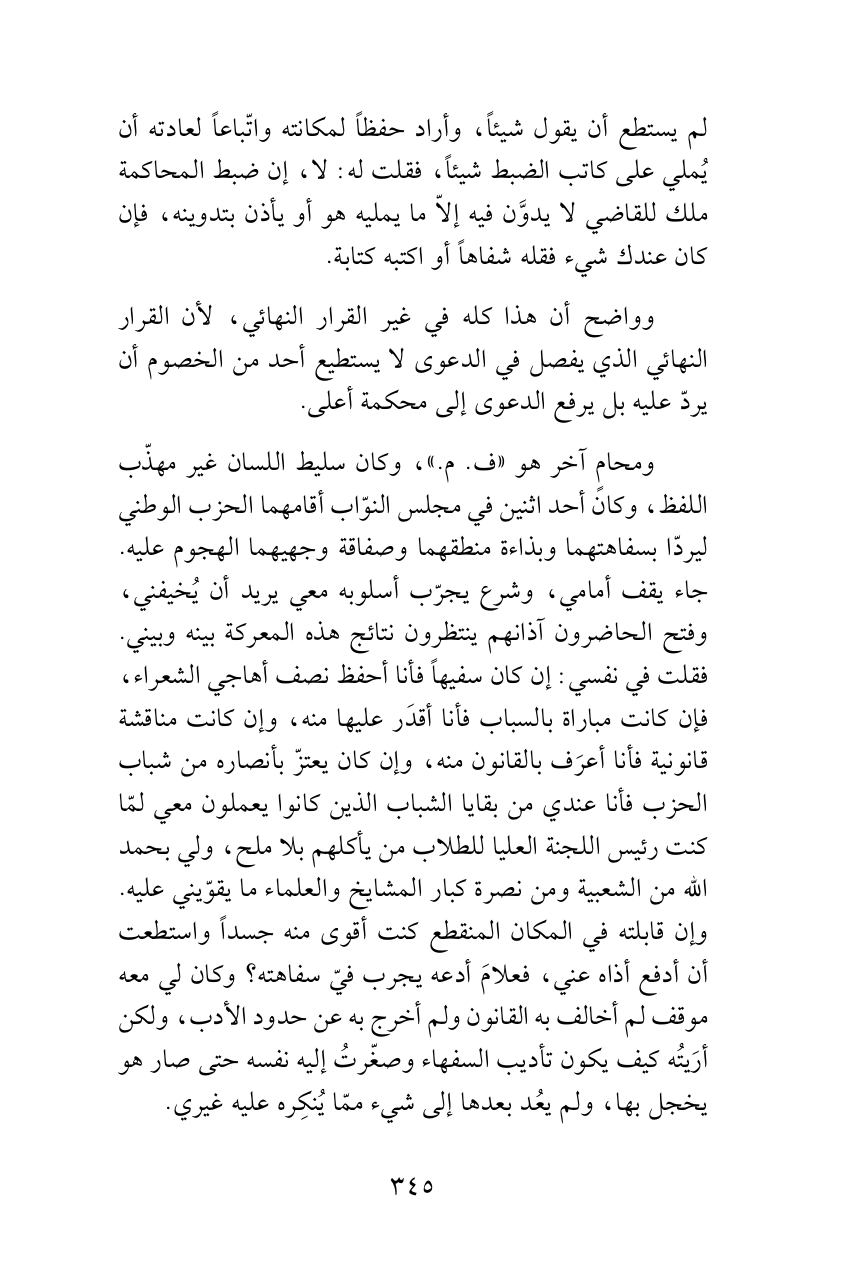 ومحامٍ آخر هو «ف. م.»، وكان سليط اللسان غير مهذّب اللفظ، وكان أحد اثنين في مجلس النوّاب أقامهما الحزب الوطني ليردّا بسفاهتهما وبذاءة منطقهما وصفاقة وجهيهما الهجوم عليه. جاء يقف أمامي، وشرع يجرّب أسلوبه معي يريد أن يُخيفني، وفتح الحاضرون آذانهم ينتظرون نتائج هذه المعركة بينه وبيني. فقلت في نفسي: إن كان سفيهاً فأنا أحفظ نصف أهاجي الشعراء، فإن كانت مباراة بالسباب فأنا أقدَر عليها منه، وإن كانت مناقشة قانونية فأنا أعرَف بالقانون منه، وإن كان يعتزّ بأنصاره من شباب الحزب فأنا عندي من بقايا الشباب الذين كانوا يعملون معي لمّا كنت رئيس اللجنة العليا للطلاب من يأكلهم بلا ملح، ولي بحمد الله من الشعبية ومن نصرة كبار المشايخ والعلماء ما يقوّيني عليه. وإن قابلته في المكان المنقطع كنت أقوى منه جسداً واستطعت أن أدفع أذاه عني، فعلامَ أدعه يجرب فيّ سفاهته؟ وكان لي معه موقف لم أخالف به القانون ولم أخرج به عن حدود الأدب، ولكن أرَيتُه كيف يكون تأديب السفهاء وصغّرتُ إليه نفسه حتى صار هو يخجل بها، ولم يعُد بعدها إلى شيء ممّا يُنكِره عليه غيري.