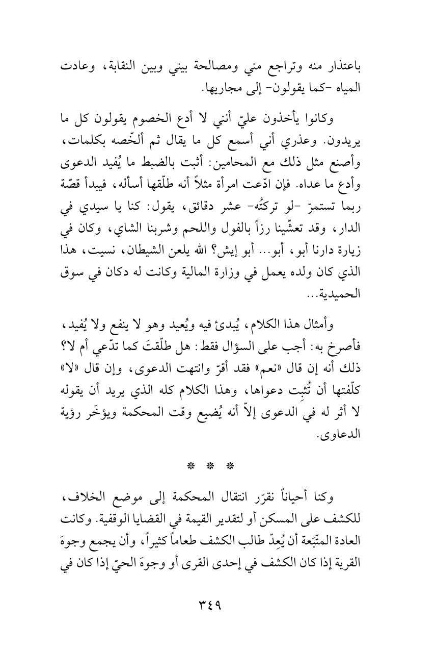 وكنا أحياناً نقرّر انتقال المحكمة إلى موضع الخلاف، للكشف على المسكن أو لتقدير القيمة في القضايا الوقفية. وكانت العادة المتّبَعة أن يُعِدّ طالب الكشف طعاماً كثيراً، وأن يجمع وجوهَ القرية إذا كان الكشف في إحدى القرى أو وجوهَ الحيّ إذا كان في