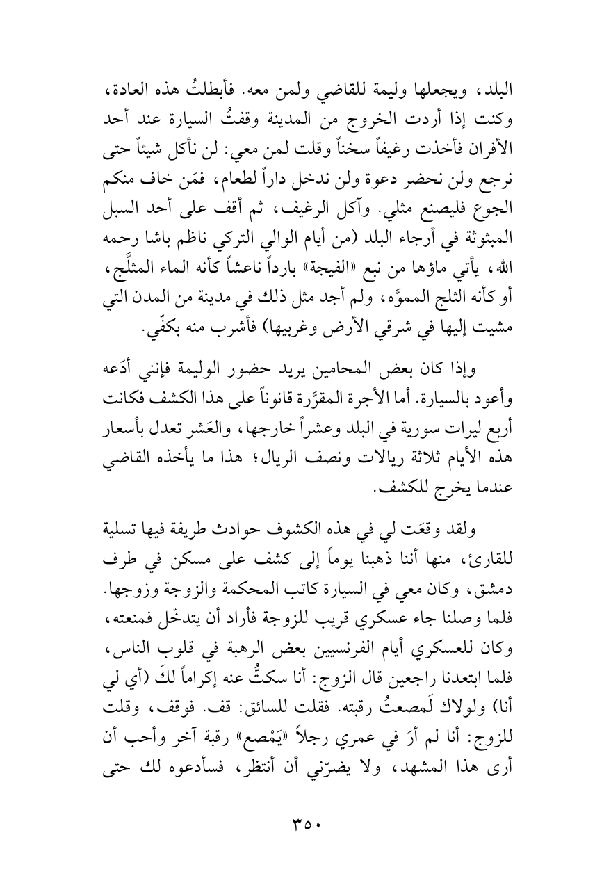 ولقد وقعَت لي في هذه الكشوف حوادث طريفة فيها تسلية للقارئ، منها أننا ذهبنا يوماً إلى كشف على مسكن في طرف دمشق، وكان معي في السيارة كاتب المحكمة والزوجة وزوجها. فلما وصلنا جاء عسكري قريب للزوجة فأراد أن يتدخّل فمنعته، وكان للعسكري أيام الفرنسيين بعض الرهبة في قلوب الناس، فلما ابتعدنا راجعين قال الزوج: أنا سكتُّ عنه إكراماً لكَ (أي لي أنا) ولولاك لَمصعتُ رقبته. فقلت للسائق: قف. فوقف، وقلت للزوج: أنا لم أرَ في عمري رجلاً «يَمْصع» رقبة آخر وأحب أن أرى هذا المشهد، ولا يضرّني أن أنتظر، فسأدعوه لك حتى