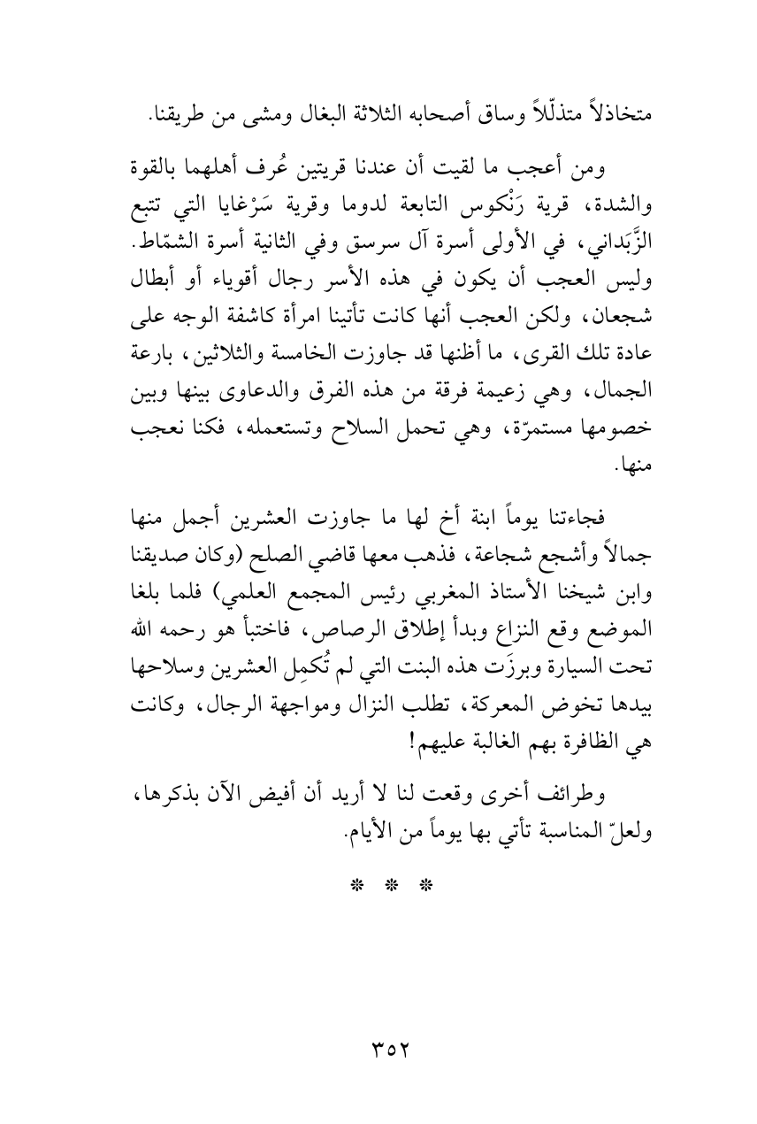 ومن أعجب ما لقيت أن عندنا قريتين عُرف أهلهما بالقوة والشدة، قرية رَنْكوس التابعة لدوما وقرية سَرْغايا التي تتبع الزَّبَداني، في الأولى أسرة آل سرسق وفي الثانية أسرة الشمّاط. وليس العجب أن يكون في هذه الأسر رجال أقوياء أو أبطال شجعان، ولكن العجب أنها كانت تأتينا امرأة كاشفة الوجه على عادة تلك القرى، ما أظنها قد جاوزت الخامسة والثلاثين، بارعة الجمال، وهي زعيمة فرقة من هذه الفرق والدعاوى بينها وبين خصومها مستمرّة، وهي تحمل السلاح وتستعمله، فكنا نعجب منها.