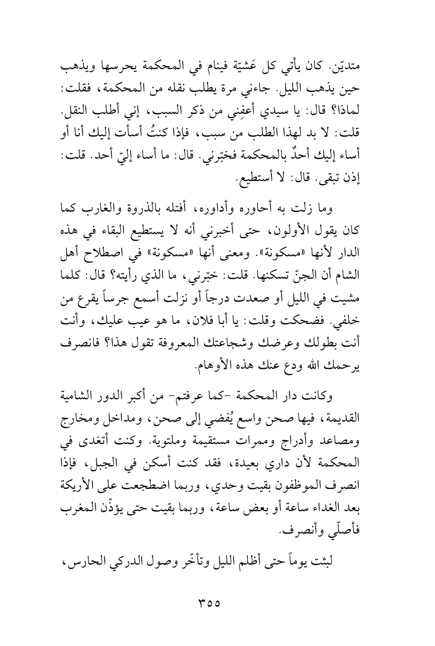 متديّن. كان يأتي كل عَشيّة فينام في المحكمة يحرسها ويذهب حين يذهب الليل. جاءني مرة يطلب نقله من المحكمة، فقلت: لماذا؟ قال: يا سيدي أعفِني من ذكر السبب، إني أطلب النقل. قلت: لا بد لهذا الطلب من سبب، فإذا كنتُ أسأت إليك أنا أو أساء إليك أحدٌ بالمحكمة فخبّرني. قال: ما أساء إليّ أحد. قلت: إذن تبقى. قال: لا أستطيع.