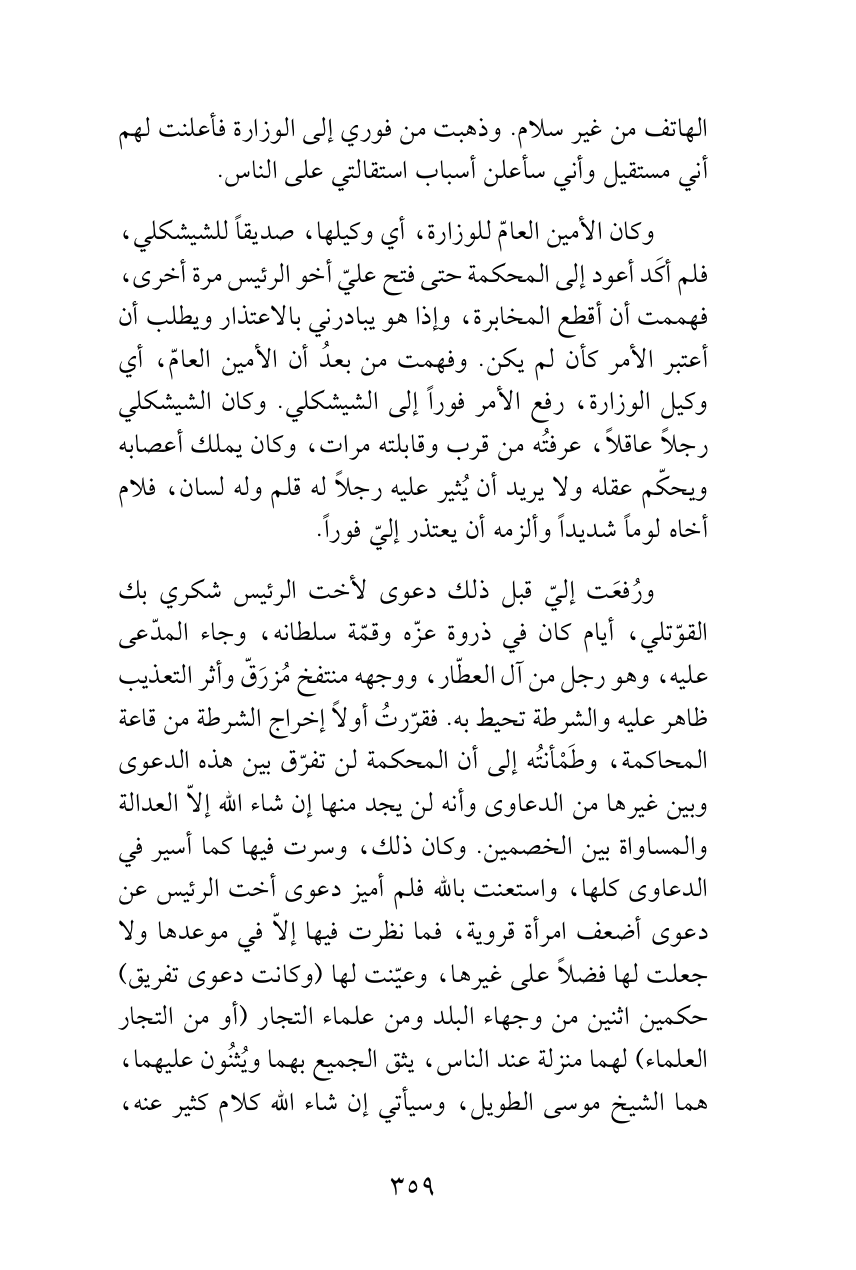 ورُفعَت إليّ قبل ذلك دعوى لأخت الرئيس شكري بك القوّتلي، أيام كان في ذروة عزّه وقمّة سلطانه، وجاء المدّعى عليه، وهو رجل من آل العطّار، ووجهه منتفخ مُزرَقّ وأثر التعذيب ظاهر عليه والشرطة تحيط به. فقرّرتُ أولاً إخراج الشرطة من قاعة المحاكمة، وطَمْأنتُه إلى أن المحكمة لن تفرّق بين هذه الدعوى وبين غيرها من الدعاوى وأنه لن يجد منها إن شاء الله إلاّ العدالة والمساواة بين الخصمين. وكان ذلك، وسرت فيها كما أسير في الدعاوى كلها، واستعنت بالله فلم أميز دعوى أخت الرئيس عن دعوى أضعف امرأة قروية، فما نظرت فيها إلاّ في موعدها ولا جعلت لها فضلاً على غيرها، وعيّنت لها (وكانت دعوى تفريق) حكمين اثنين من وجهاء البلد ومن علماء التجار (أو من التجار العلماء) لهما منزلة عند الناس، يثق الجميع بهما ويُثنُون عليهما، هما الشيخ موسى الطويل، وسيأتي إن شاء الله كلام كثير عنه،