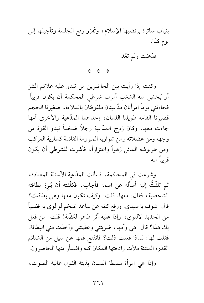وكنت إذا رأيت بين الحاضرين من تبدو عليه علائم الشرّ أو يُخشى منه الشغب أمرت شرطي المحكمة أن يكون قريباً. فجاءتني يوماً امرأتان مدّعيتان ملفوفتان بالملاءة، صغيرتا الحجم قصيرتا القامة طويلتا اللسان، إحداهما المدّعية والأخرى أمها جاءت معها. وكان زوج المدّعية رجلاً ضخماً تبدو القوة من وجهه ومن عضلاته ومن شواربه المبرومة القائمة كسارية المركب ومن طربوشه المائل زهواً واعتزازاً، فأشرت للشرطي أن يكون قريباً منه.