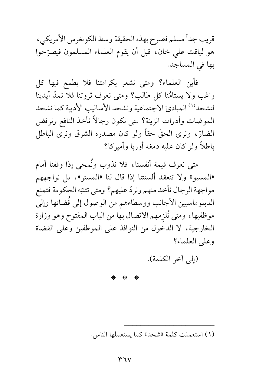 فأين العلماء؟ ومتى نشعر بكرامتنا فلا يطمع فيها كل راغب ولا يستامُنا كل طالب؟ ومتى نعرف ثروتنا فلا نمدّ أيدينا لنشحد (¬1) المبادئ الاجتماعية ونشحد الأساليب الأدبية كما نشحد الموضات وأدوات الزينة؟ متى نكون رجالاً نأخذ النافع ونرفض الضارّ، ونرى الحقّ حقاً ولو كان مصدره الشرق ونرى الباطل باطلاً ولو كان عليه دمغة أوربا وأميركا؟