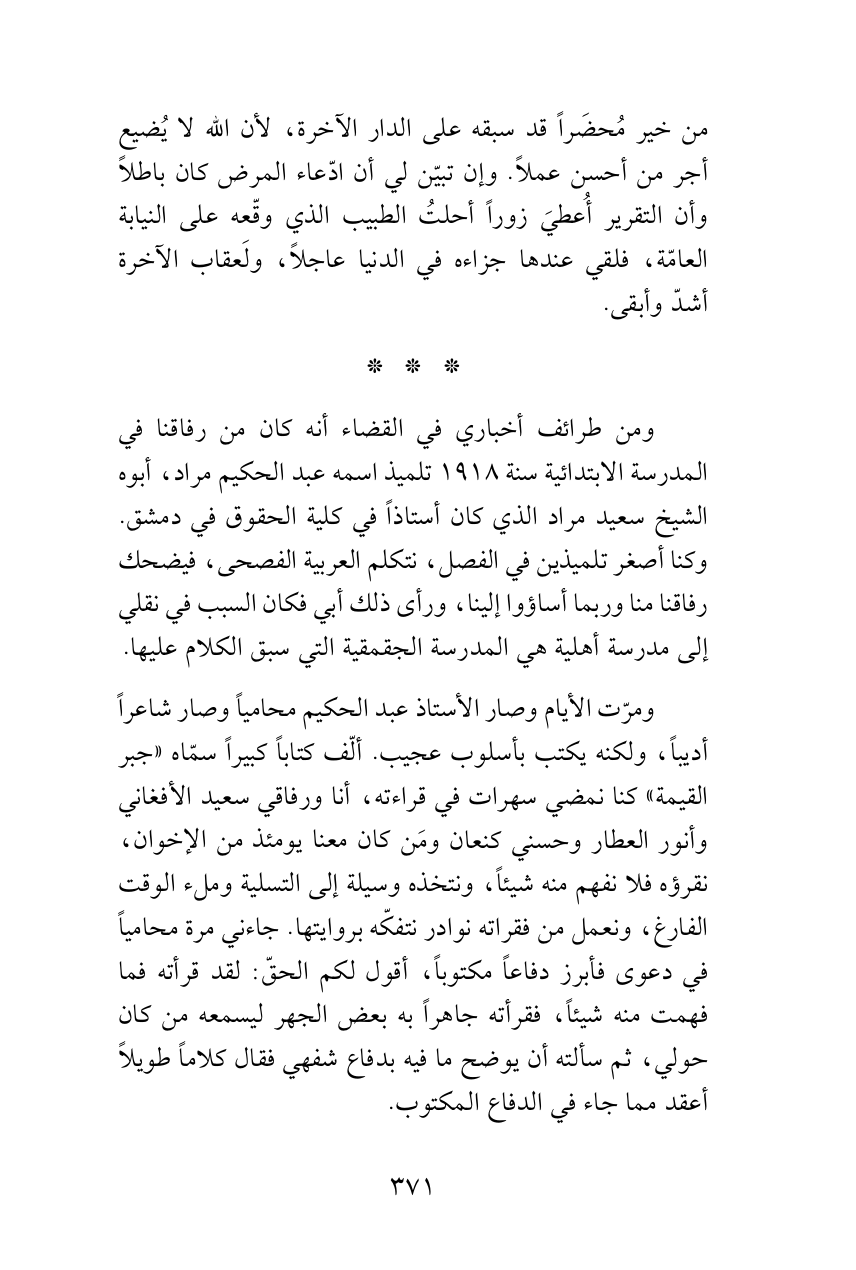 ومن طرائف أخباري في القضاء أنه كان من رفاقنا في المدرسة الابتدائية سنة 1918 تلميذ اسمه عبد الحكيم مراد، أبوه الشيخ سعيد مراد الذي كان أستاذاً في كلية الحقوق في دمشق. وكنا أصغر تلميذين في الفصل، نتكلم العربية الفصحى، فيضحك رفاقنا منا وربما أساؤوا إلينا، ورأى ذلك أبي فكان السبب في نقلي إلى مدرسة أهلية هي المدرسة الجقمقية التي سبق الكلام عليها.