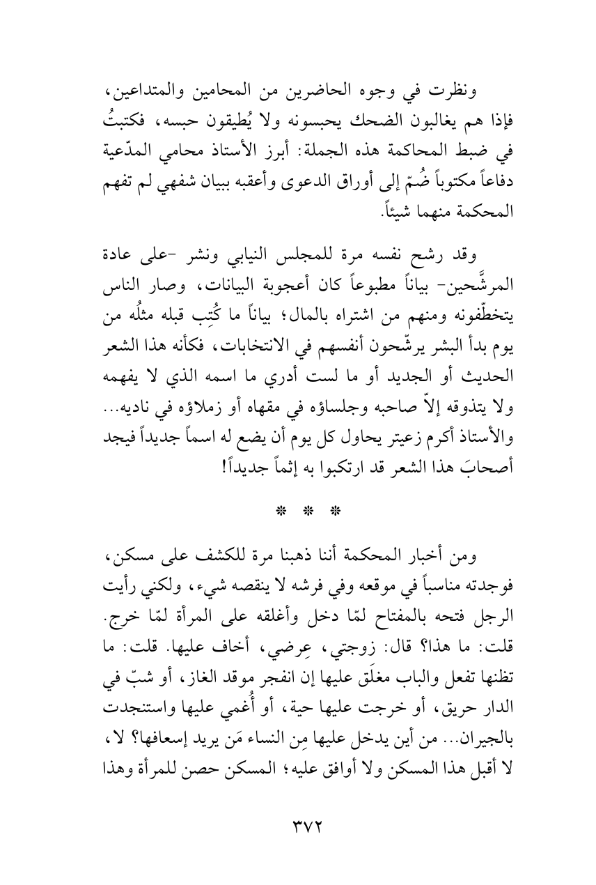 ومن أخبار المحكمة أننا ذهبنا مرة للكشف على مسكن، فوجدته مناسباً في موقعه وفي فرشه لا ينقصه شيء، ولكني رأيت الرجل فتحه بالمفتاح لمّا دخل وأغلقه على المرأة لمّا خرج. قلت: ما هذا؟ قال: زوجتي، عِرضي، أخاف عليها. قلت: ما تظنها تفعل والباب مغلَق عليها إن انفجر موقد الغاز، أو شبّ في الدار حريق، أو خرجت عليها حية، أو أُغمي عليها واستنجدت بالجيران ... من أين يدخل عليها مِن النساء مَن يريد إسعافها؟ لا، لا أقبل هذا المسكن ولا أوافق عليه؛ المسكن حصن للمرأة وهذا