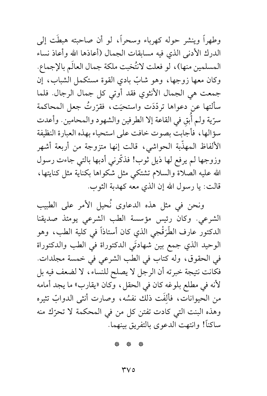 وطهراً وينشر حوله كهرباء وسحراً، لو أن صاحبته هبطَت إلى الدرك الأدنى الذي فيه مسابقات الجمال (أعاذها الله وأعاذ نساء المسلمين منها)، لو فعلت لانتُخبت ملكة جمال العالَم بالإجماع. وكان معها زوجها، وهو شابّ بادي القوة مستكمل الشباب، إن جمعت هي الجمال الأنثوي فقد أوتي كل جمال الرجال. فلما سألتها عن دعواها تردّدَت واستحيَت، فقرّرتُ جعل المحاكمة سرّية ولم أُبقِ في القاعة إلا الطرفين والشهود والمحامين. وأعدت سؤالها، فأجابت بصوت خافت على استحياء بهذه العبارة النظيفة الألفاظ المهذّبة الحواشي، قالت إنها متزوجة من أربعة أشهر وزوجها لم يرفع لها ذيل ثوب! فذكّرني أدبها بالتي جاءت رسول الله عليه الصلاة والسلام تشتكي مثل شكواها بكناية مثل كنايتها، قالت: يا رسول الله إن الذي معه كهدبة الثوب.