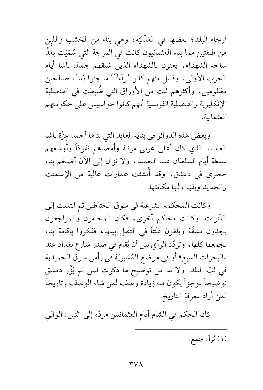 أرجاء البلد؛ بعضها في العَدْليّة، وهي بناء من الخشب واللبِن من طبقتين مما بناه العثمانيون كانت في المرجة التي سُمّيَت بعدُ ساحة الشهداء، يعنون بالشهداء الذين شنقهم جمال باشا أيام الحرب الأولى، وقليل منهم كانوا بُرآء (¬1) ما جنوا ذنباً، صالحين مظلومين، وأكثرهم ثبت من الأوراق التي ضُبطت في القنصلية الإنكليزية والقنصلية الفرنسية أنهم كانوا جواسيس على حكومتهم العثمانية.