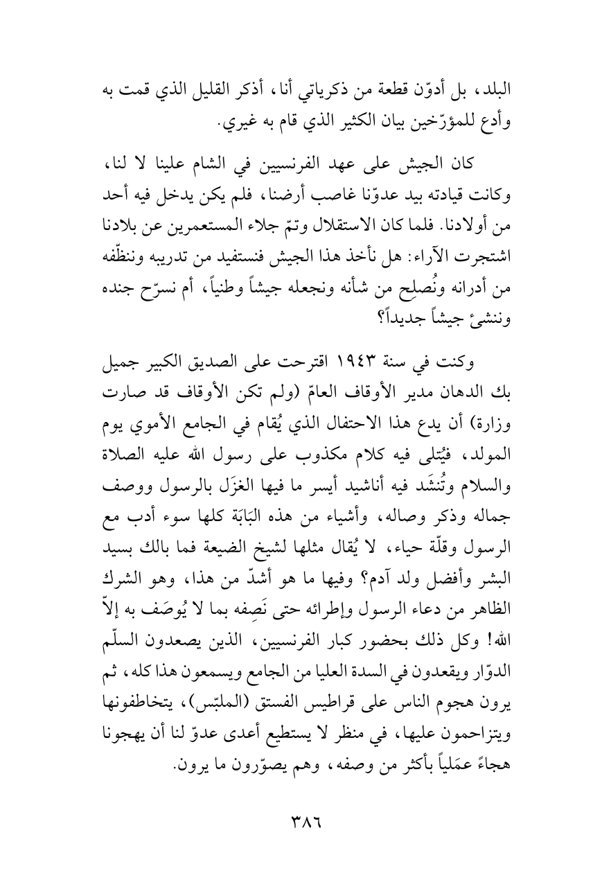 وكنت في سنة 1943 اقترحت على الصديق الكبير جميل بك الدهان مدير الأوقاف العامّ (ولم تكن الأوقاف قد صارت وزارة) أن يدع هذا الاحتفال الذي يُقام في الجامع الأموي يوم المولد، فيُتلى فيه كلام مكذوب على رسول الله عليه الصلاة والسلام وتُنشَد فيه أناشيد أيسر ما فيها الغزَل بالرسول ووصف جماله وذكر وصاله، وأشياء من هذه البَابَة كلها سوء أدب مع الرسول وقلّة حياء، لا يُقال مثلها لشيخ الضيعة فما بالك بسيد البشر وأفضل ولد آدم؟ وفيها ما هو أشدّ من هذا، وهو الشرك الظاهر من دعاء الرسول وإطرائه حتى نَصِفه بما لا يُوصَف به إلاّ الله! وكل ذلك بحضور كبار الفرنسيين، الذين يصعدون السلّم الدوّار ويقعدون في السدة العليا من الجامع ويسمعون هذا كله، ثم يرون هجوم الناس على قراطيس الفستق (الملبّس)، يتخاطفونها ويتزاحمون عليها، في منظر لا يستطيع أعدى عدوّ لنا أن يهجونا هجاءً عمَلياً بأكثر من وصفه، وهم يصوّرون ما يرون.