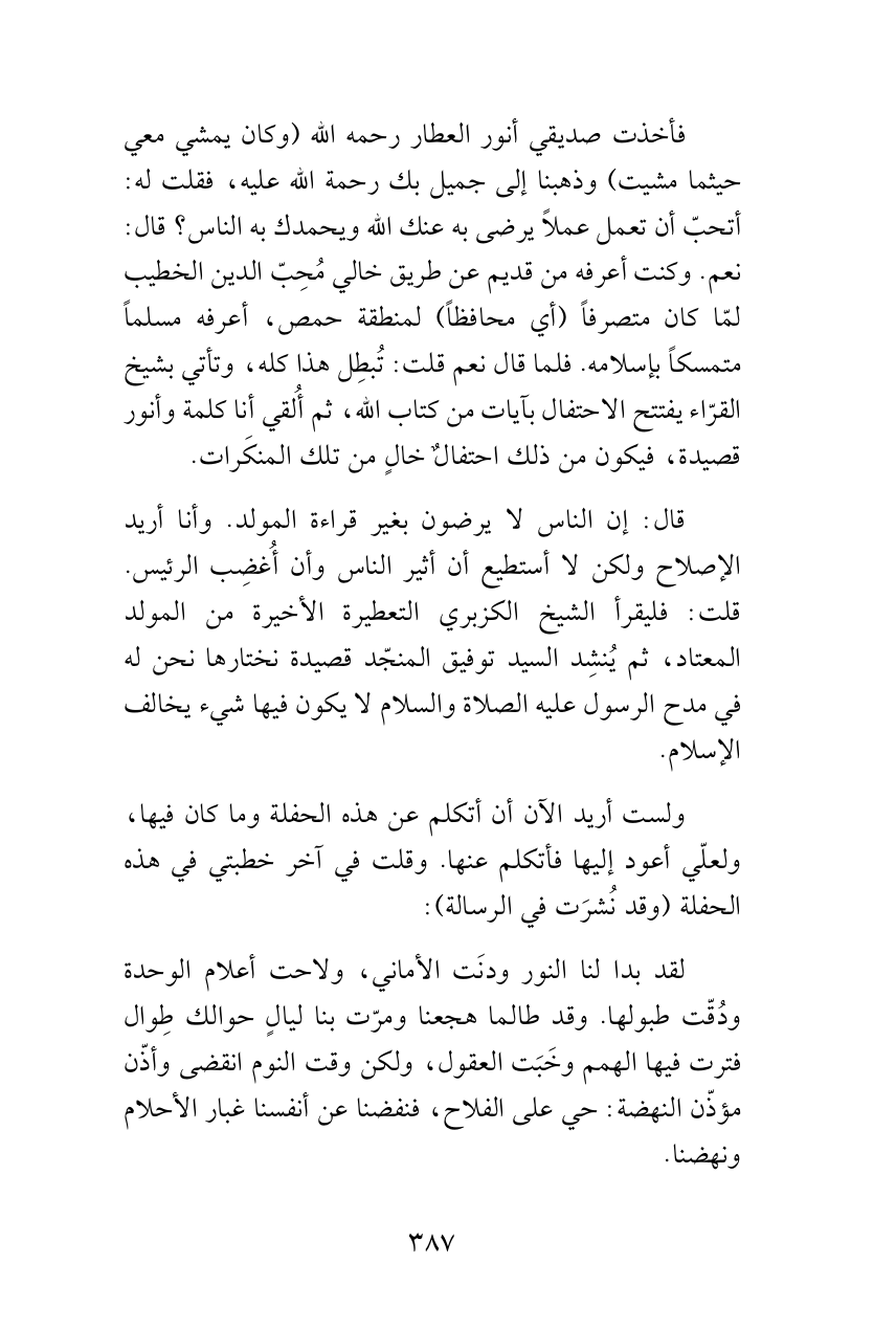 قال: إن الناس لا يرضون بغير قراءة المولد. وأنا أريد الإصلاح ولكن لا أستطيع أن أثير الناس وأن أُغضِب الرئيس. قلت: فليقرأ الشيخ الكزبري التعطيرة الأخيرة من المولد المعتاد، ثم يُنشِد السيد توفيق المنجّد قصيدة نختارها نحن له في مدح الرسول عليه الصلاة والسلام لا يكون فيها شيء يخالف الإسلام.