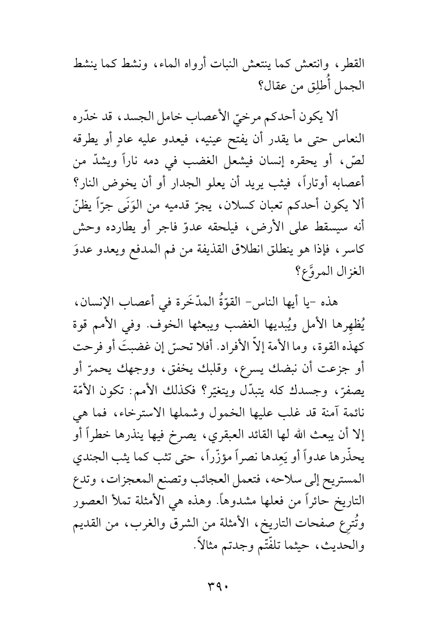 ألا يكون أحدكم مرخيّ الأعصاب خامل الجسد، قد خدّره النعاس حتى ما يقدر أن يفتح عينيه، فيعدو عليه عادٍ أو يطرقه لصّ، أو يحقره إنسان فيشعل الغضب في دمه ناراً ويشدّ من أعصابه أوتاراً، فيثب يريد أن يعلو الجدار أو أن يخوض النار؟ ألا يكون أحدكم تعبان كسلان، يجرّ قدميه من الوَنَى جرّاً يظنّ أنه سيسقط على الأرض، فيلحقه عدوّ فاجر أو يطارده وحش كاسر، فإذا هو ينطلق انطلاق القذيفة من فم المدفع ويعدو عدوَ الغزال المروَّع؟