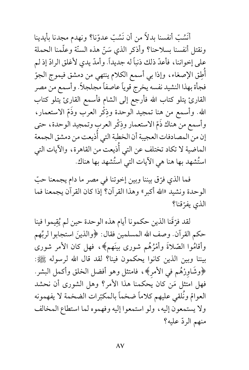 فما الذي فرّق بيننا وبين إخوتنا في مصر ما دام يجمعنا حبّ الوحدة ونشيد «الله أكبر» وهذا القرآن؟ إذا كان القرآن يجمعنا فما الذي يفرّقنا؟
