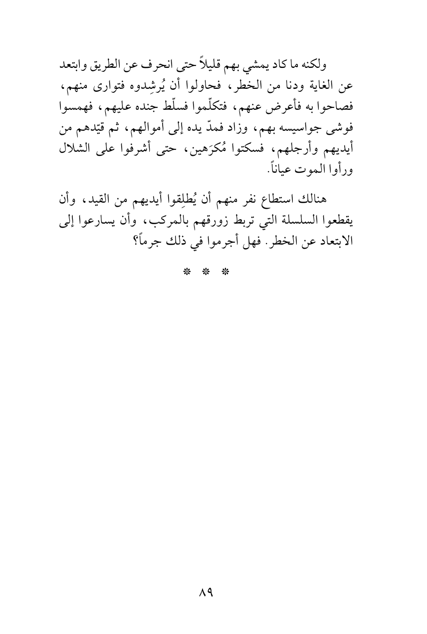 هنالك استطاع نفر منهم أن يُطلِقوا أيديهم من القيد، وأن يقطعوا السلسلة التي تربط زورقهم بالمركب، وأن يسارعوا إلى الابتعاد عن الخطر. فهل أجرموا في ذلك جرماً؟
