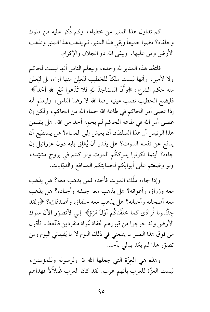 فلتعُد هذه المنابر لله وحده، وليعلم الناس أنها ليست لحاكم ولا لأمير، وأنها ليست ملكاً للخطيب ليُعلِن منها آراءه بل ليُعلن منه حكم الشرع: {وأَنّ المسَاجدَ للهِ فلا تَدْعوا مَعَ اللهِ أحَداً}. فليضع الخطيب نصب عينيه رضا الله لا رضا الناس، وليعلم أنه إذا عصى أمر الحاكم في طاعة الله حماه الله من الحاكم، ولكن إن عصى أمر الله في طاعة الحاكم لم يحمِه أحد من الله. هل يضمن هذا الرئيس أو هذا السلطان أن يعيش إلى المساء؟ هل يستطيع أن يدفع عن نفسه الموت؟ هل يقدر أن يُغلِق بابه دون عزرائيل إن جاءه؟ أينما تكونوا يدرِكْكُم الموت ولو كنتم في بروج مشيّدة، ولو وضعتم على أبوابكم لحمايتكم المدافع والدبّابات.