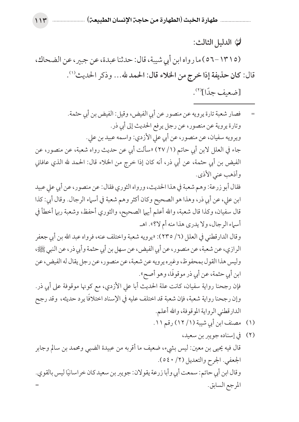 (١٣١٥ - ٥٦) ما رواه ابن أبي شيبة، قال: حدثنا عبدة، عن جبير، عن الضحاك، قال: كان حذيفة إذا خرج من الخلاء قال: الحمد لله ... وذكر الحديث (¬١).