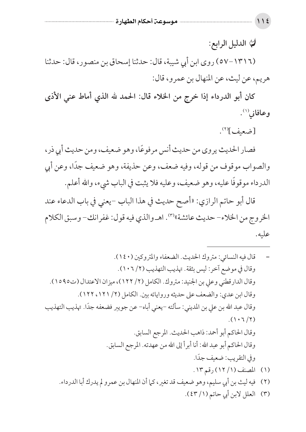 قال أبو حاتم الرازي: «أصح حديث في هذا الباب -يعني في باب الدعاء عند الخروج من الخلاء- حديث عائشة» (¬٣). اهـ والذي فيه قول: غفرانك- وسبق الكلام عليه.