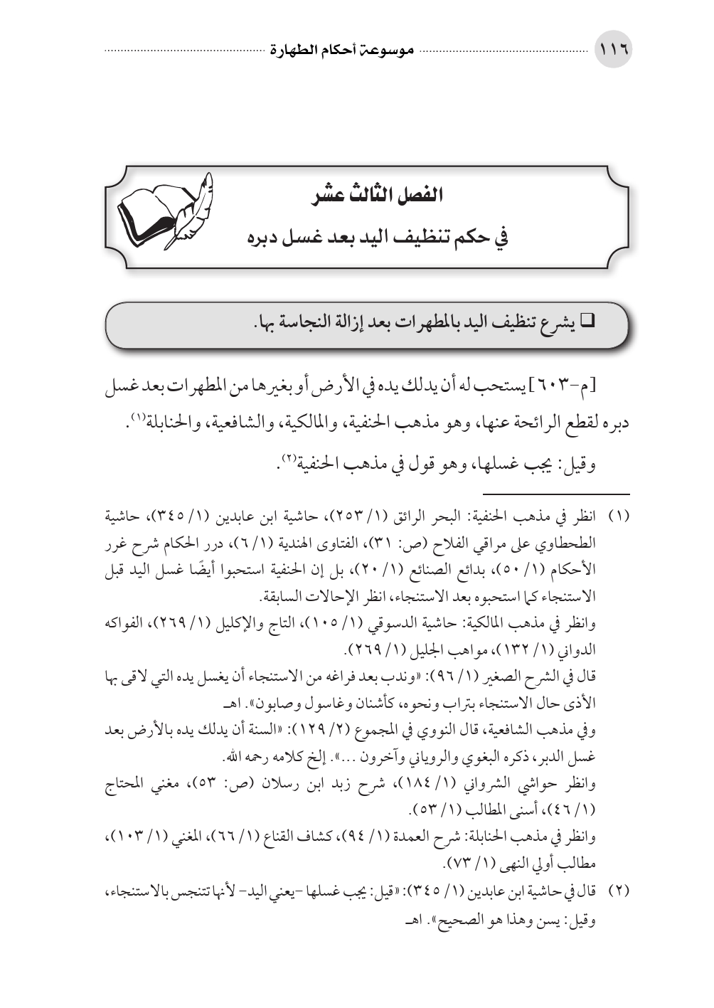 (¬١) انظر في مذهب الحنفية: البحر الرائق (١/ ٢٥٣)، حاشية ابن عابدين (١/ ٣٤٥)، حاشية الطحطاوي على مراقي الفلاح (ص: ٣١)، الفتاوى الهندية (١/ ٦)، درر الحكام شرح غرر الأحكام (١/ ٥٠)، بدائع الصنائع (١/ ٢٠)، بل إن الحنفية استحبوا أيضًا غسل اليد قبل الاستنجاء كما استحبوه بعد الاستنجاء، انظر الإحالات السابقة.