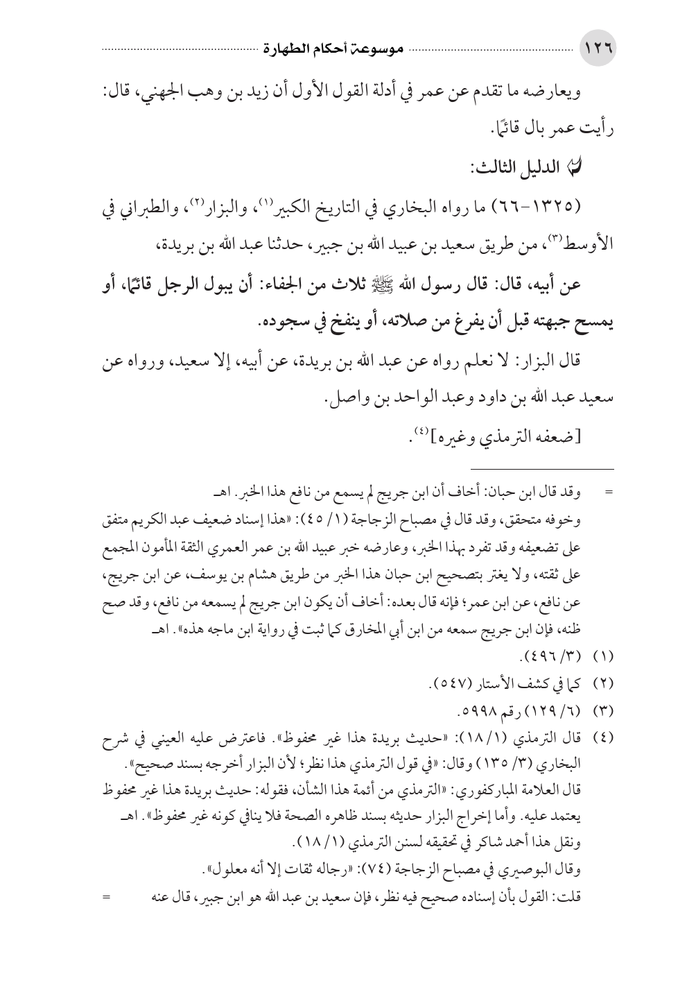 (¬٤) قال الترمذي (١/ ١٨): «حديث بريدة هذا غير محفوظ». فاعترض عليه العيني في شرح البخاري (٣/ ١٣٥) وقال: «في قول الترمذي هذا نظر؛ لأن البزار أخرجه بسند صحيح».