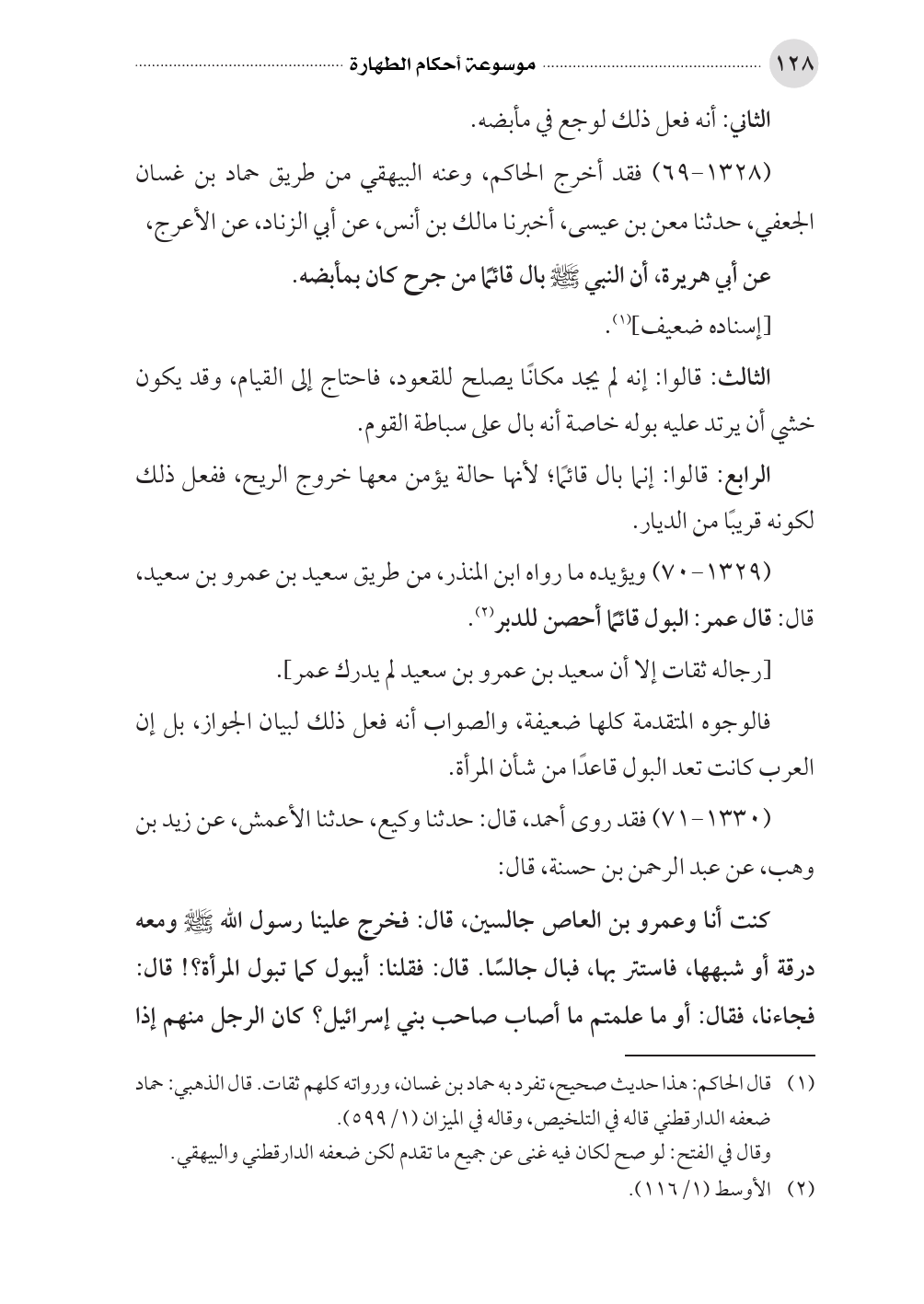 كنت أنا وعمرو بن العاص جالسين، قال: فخرج علينا رسول الله صلى الله عليه وسلم ومعه درقة أو شبهها، فاستتر بها، فبال جالسًا. قال: فقلنا: أيبول كما تبول المرأة؟ ! قال: فجاءنا، فقال: أو ما علمتم ما أصاب صاحب بني إسرائيل؟ كان الرجل منهم إذا