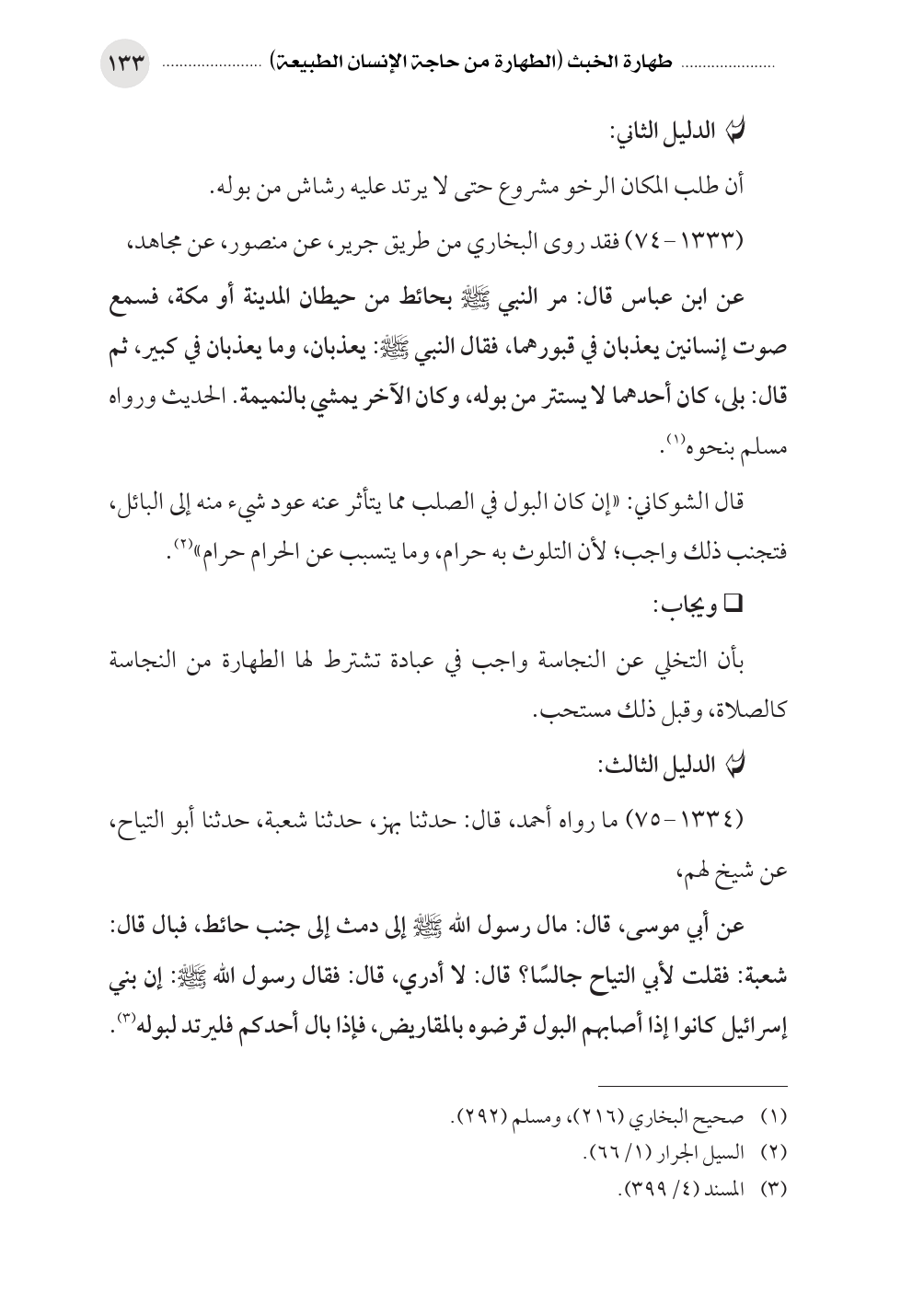 قال الشوكاني: «إن كان البول في الصلب مما يتأثر عنه عود شيء منه إلى البائل، فتجنب ذلك واجب؛ لأن التلوث به حرام، وما يتسبب عن الحرام حرام» (¬٢).