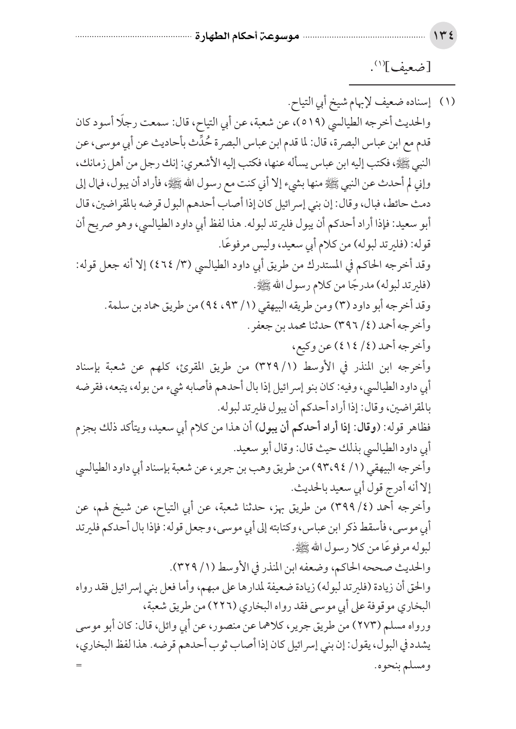 والحديث أخرجه الطيالسي (٥١٩)، عن شعبة، عن أبي التياح، قال: سمعت رجلًا أسود كان قدم مع ابن عباس البصرة، قال: لما قدم ابن عباس البصرة حُدِّث بأحاديث عن أبي موسى، عن النبي صلى الله عليه وسلم، فكتب إليه ابن عباس يسأله عنها، فكتب إليه الأشعري: إنك رجل من أهل زمانك، وإني لم أحدث عن النبي صلى الله عليه وسلم منها بشيء إلا أني كنت مع رسول الله صلى الله عليه وسلم، فأراد أن يبول، فمال إلى دمث حائط، فبال، وقال: إن بني إسرائيل كان إذا أصاب أحدهم البول قرضه بالمقراضين، قال أبو سعيد: فإذا أراد أحدكم أن يبول فليرتد لبوله. هذا لفظ أبي داود الطيالسي، وهو صريح أن قوله: (فليرتد لبوله) من كلام أبي سعيد، وليس مرفوعًا.