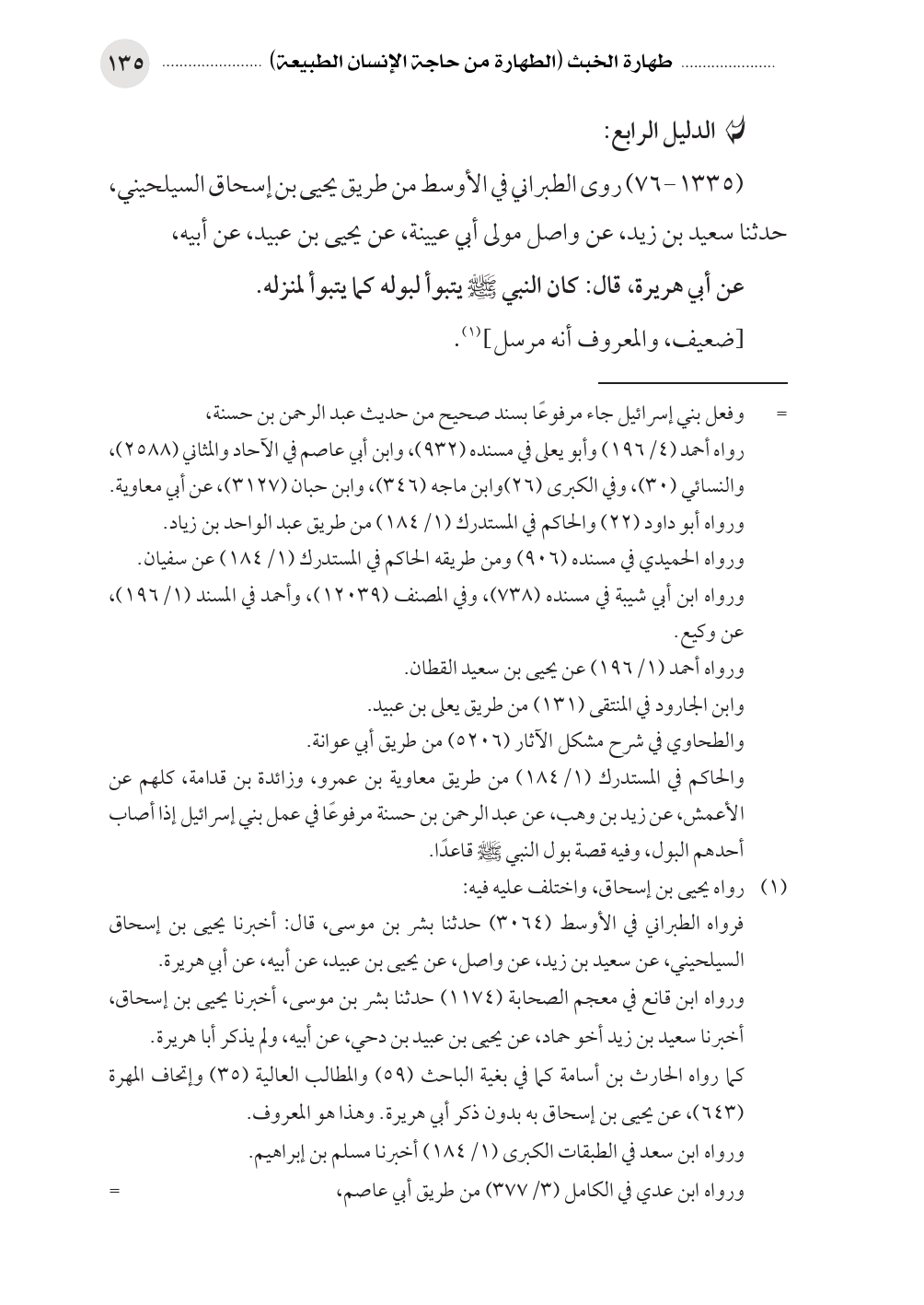(١٣٣٥ - ٧٦) روى الطبراني في الأوسط من طريق يحيى بن إسحاق السيلحيني، حدثنا سعيد بن زيد، عن واصل مولى أبي عيينة، عن يحيى بن عبيد، عن أبيه،