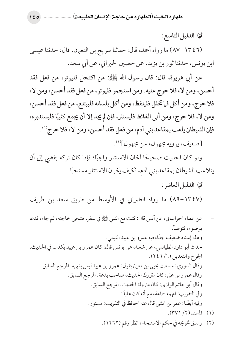 (١٣٤٦ - ٨٧) ما رواه أحمد، قال: حدثنا سريج بن النعمان، قال: حدثنا عيسى ابن يونس، حدثنا ثور بن يزيد، عن حصين الحبراني، عن أبي سعد،