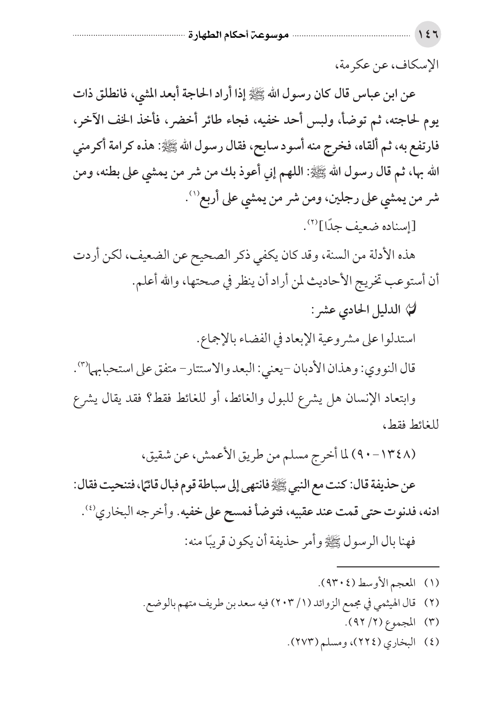 عن ابن عباس قال كان رسول الله صلى الله عليه وسلم إذا أراد الحاجة أبعد المشي، فانطلق ذات يوم لحاجته، ثم توضأ، ولبس أحد خفيه، فجاء طائر أخضر، فأخذ الخف الآخر، فارتفع به، ثم ألقاه، فخرج منه أسود سابح، فقال رسول الله صلى الله عليه وسلم: هذه كرامة أكرمني الله بها، ثم قال رسول الله صلى الله عليه وسلم: اللهم إني أعوذ بك من شر من يمشي على بطنه، ومن شر من يمشي على رجلين، ومن شر من يمشي على أربع (¬١).