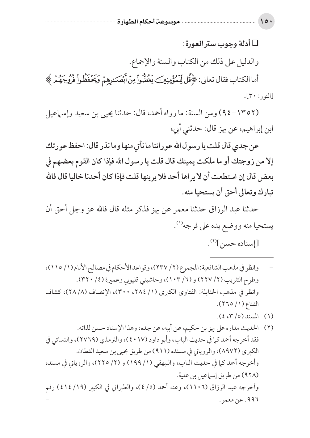 عن جدي قال قلت يا رسول الله عوراتنا ما نأتي منها وما نذر قال: احفظ عورتك إلا من زوجتك أو ما ملكت يمينك قال قلت يا رسول الله فإذا كان القوم بعضهم في بعض قال إن استطعت أن لا يراها أحد فلا يرينها قلت فإذا كان أحدنا خاليا قال فالله تبارك وتعالى أحق أن يستحيا منه.
