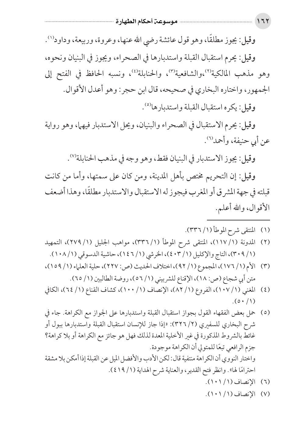 (¬٥) حمل بعض الفقهاء القول بجواز استقبال القبلة واستدبارها على الجواز مع الكراهة. جاء في شرح البخاري للسفيري (٢/ ٣٢٦): «إذا جاز للإنسان استقبال القبلة واستدبارها ببول أو غائط بالشروط المذكورة في غير الأخلية المعدة لذلك فهل هو جائز مع الكراهة أو بلا كراهة؟ جزم الرافعي تبعًا للمتولي أن الكراهة موجودة.