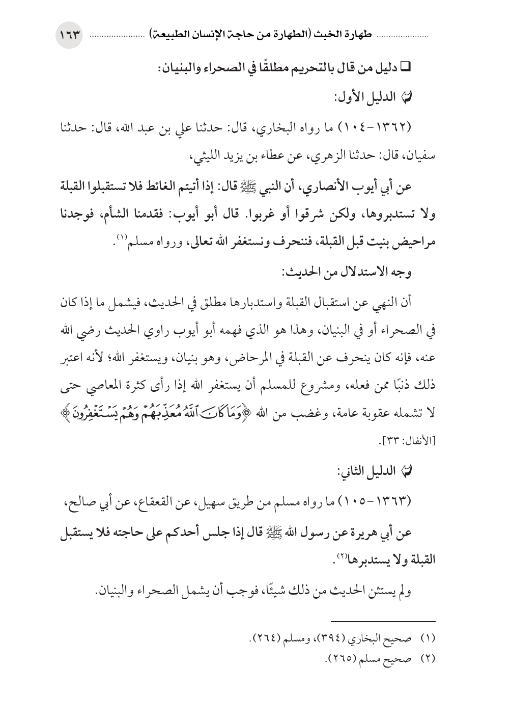 أن النهي عن استقبال القبلة واستدبارها مطلق في الحديث، فيشمل ما إذا كان في الصحراء أو في البنيان، وهذا هو الذي فهمه أبو أيوب راوي الحديث رضي الله عنه، فإنه كان ينحرف عن القبلة في المرحاض، وهو بنيان، ويستغفر الله؛ لأنه اعتبر ذلك ذنبًا ممن فعله، ومشروع للمسلم أن يستغفر الله إذا رأى كثرة المعاصي حتى لا تشمله عقوبة عامة، وغضب من الله (وَمَا كَانَ اللَّهُ مُعَذِّبَهُمْ وَهُمْ يَسْتَغْفِرُونَ) [الأنفال: ٣٣].