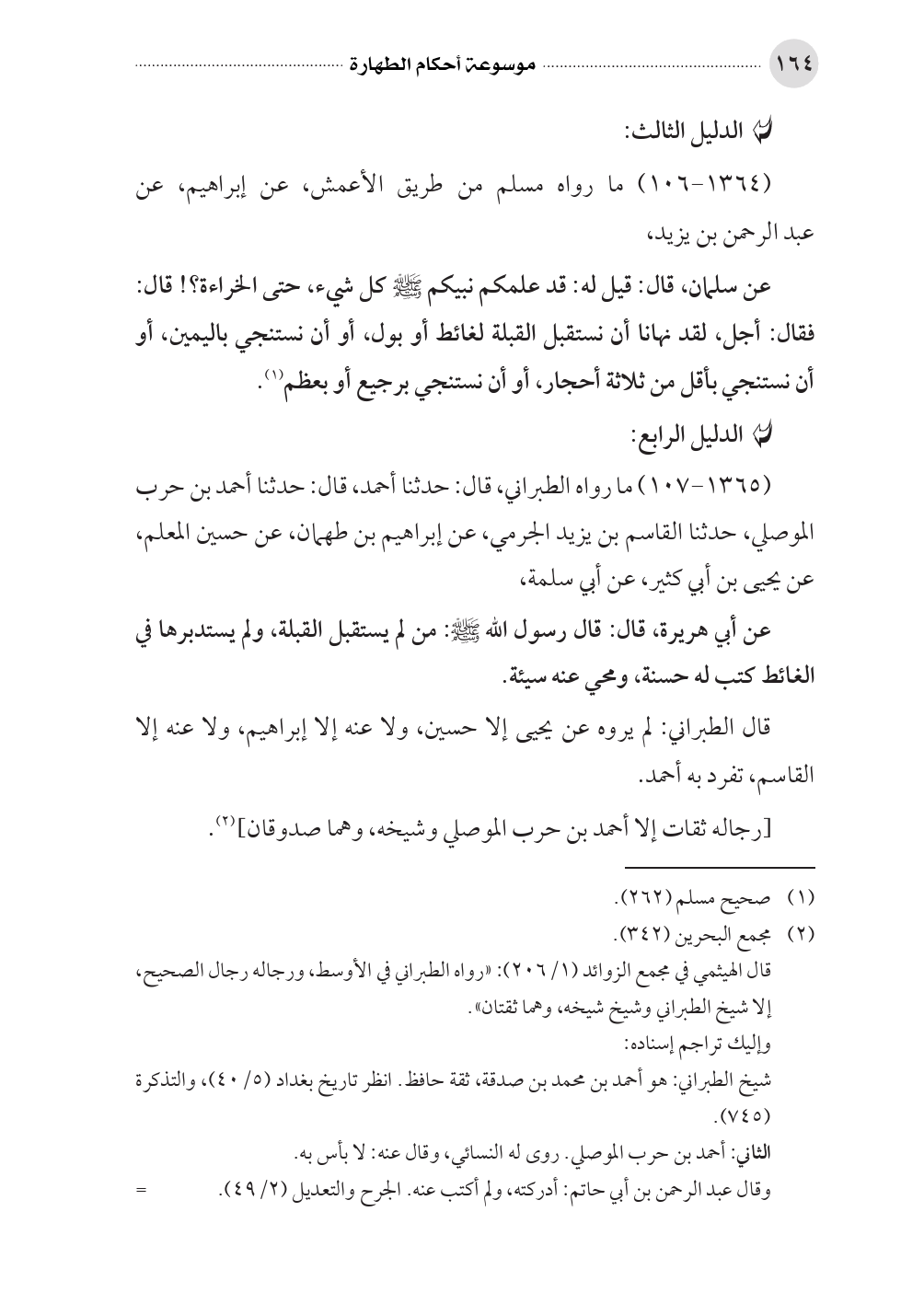 (١٣٦٥ - ١٠٧) ما رواه الطبراني، قال: حدثنا أحمد، قال: حدثنا أحمد بن حرب الموصلي، حدثنا القاسم بن يزيد الجرمي، عن إبراهيم بن طهمان، عن حسين المعلم، عن يحيى بن أبي كثير، عن أبي سلمة،