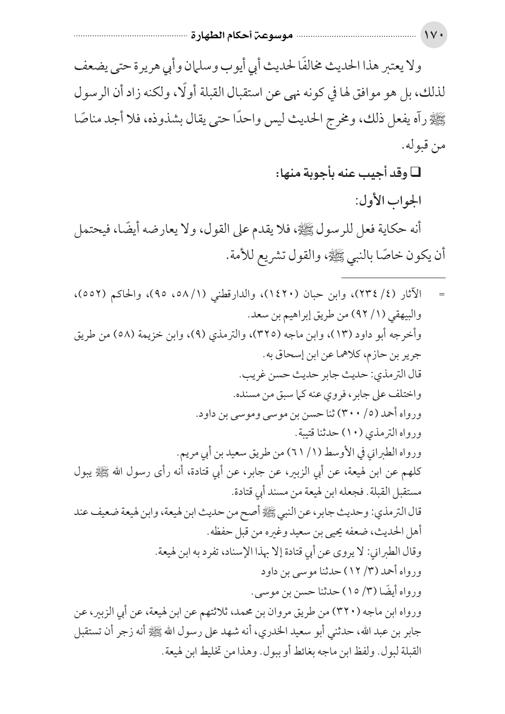 ولا يعتبر هذا الحديث مخالفًا لحديث أبي أيوب وسلمان وأبي هريرة حتى يضعف لذلك، بل هو موافق لها في كونه نهى عن استقبال القبلة أولًا، ولكنه زاد أن الرسول صلى الله عليه وسلم رآه يفعل ذلك، ومخرج الحديث ليس واحدًا حتى يقال بشذوذه، فلا أجد مناصًا من قبوله.