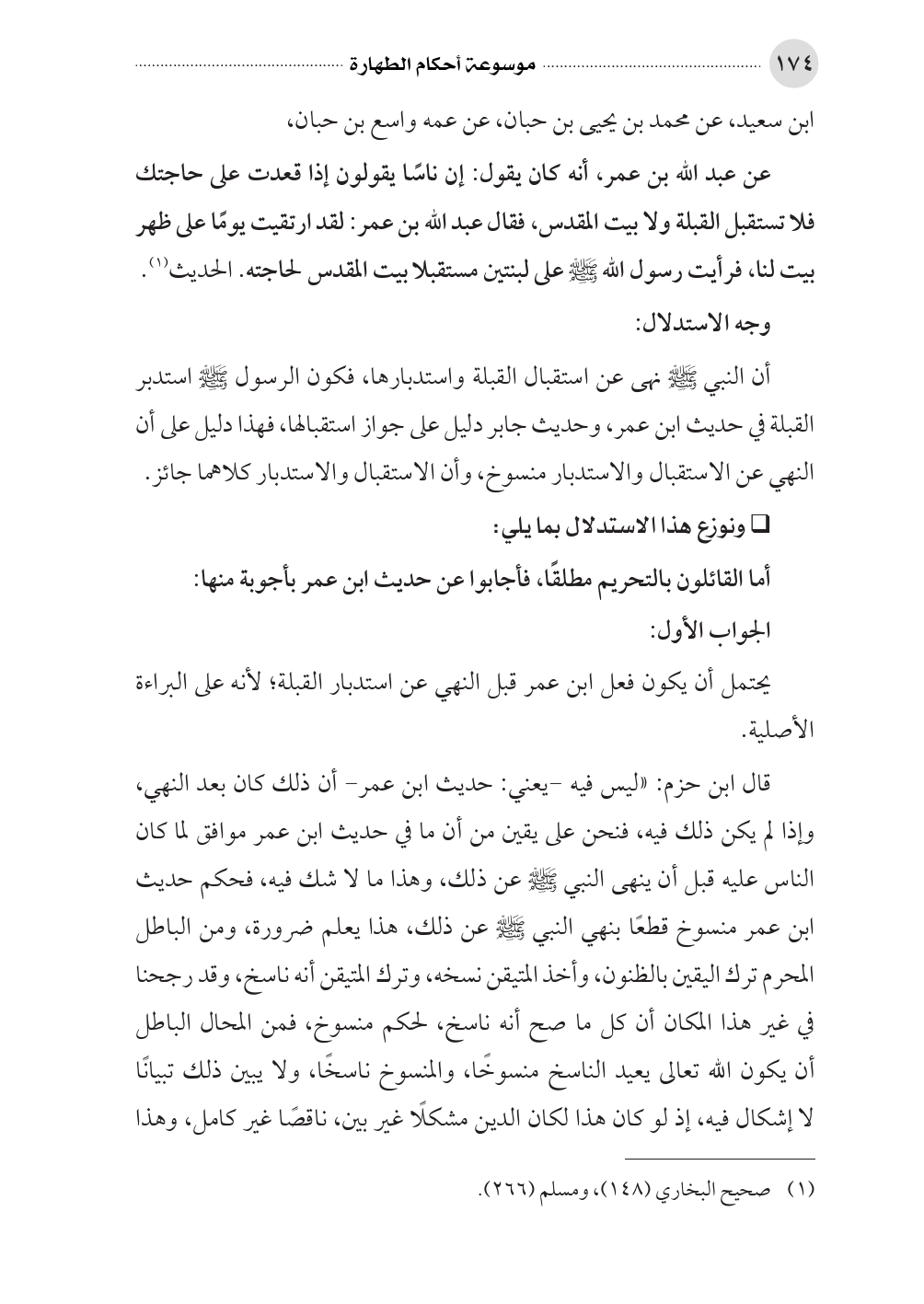 عن عبد الله بن عمر، أنه كان يقول: إن ناسًا يقولون إذا قعدت على حاجتك فلا تستقبل القبلة ولا بيت المقدس، فقال عبد الله بن عمر: لقد ارتقيت يومًا على ظهر بيت لنا، فرأيت رسول الله صلى الله عليه وسلم على لبنتين مستقبلا بيت المقدس لحاجته. الحديث (¬١).