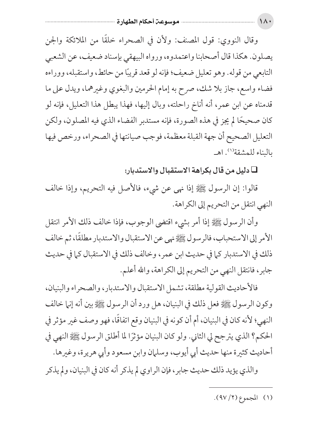 وقال النووي: قول المصنف: ولأن في الصحراء خلقًا من الملائكة والجن يصلون. هكذا قال أصحابنا واعتمدوه، ورواه البيهقي بإسناد ضعيف، عن الشعبي التابعي من قوله. وهو تعليل ضعيف؛ فإنه لو قعد قريبًا من حائط، واستقبله، ووراءه فضاء واسع، جاز بلا شك، صرح به إمام الحرمين والبغوي وغيرهما، ويدل على ما قدمناه عن ابن عمر، أنه أناخ راحلته، وبال إليها، فهذا يبطل هذا التعليل، فإنه لو كان صحيحًا لم يجز في هذه الصورة، فإنه مستدبر الفضاء الذي فيه المصلون، ولكن التعليل الصحيح أن جهة القبلة معظمة، فوجب صيانتها في الصحراء، ورخص فيها بالبناء للمشقة (¬١). اهـ