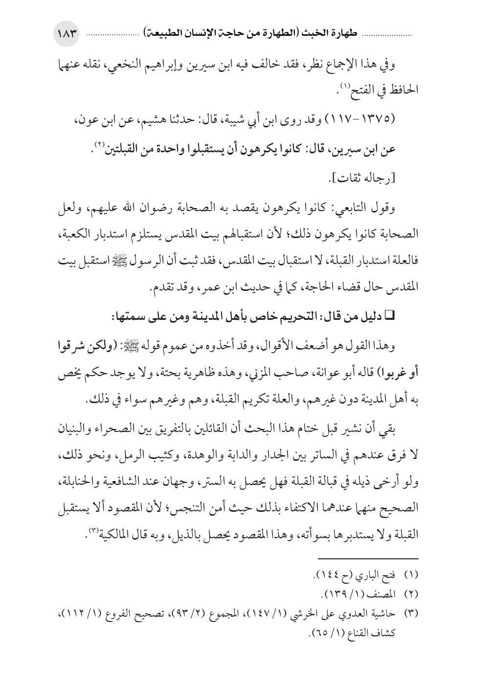 عن ابن سيرين، قال: كانوا يكرهون أن يستقبلوا واحدة من القبلتين (¬٢).