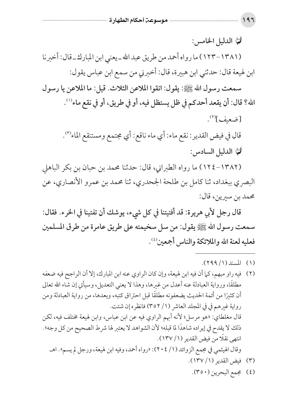 (¬٢) فيه راو مبهم، كما أن فيه ابن لهيعة، وإن كان الراوي عنه ابن المبارك، إلا أن الراجح فيه ضعفه مطلقًا، ورواية العبادلة عنه أعدل من غيرها، وهذا لا يعني التعديل، وسيأتي إن شاء الله تعالى أن كثيرًا من أئمة الحديث يضعفونه مطلقًا قبل احتراق كتبه، وبعدها، من رواية العبادلة ومن رواية غيرهم في في المجلد العاشر (١/ ٣٥٢) فانظره إن شئت.