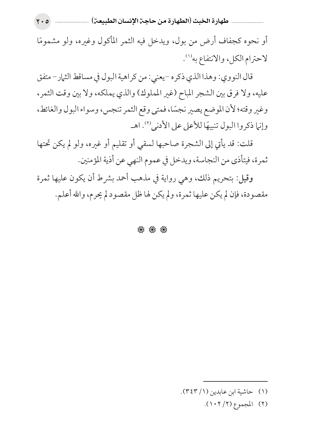 قال النووي: وهذا الذي ذكره -يعني: من كراهية البول في مساقط الثمار- متفق عليه، ولا فرق بين الشجر المباح (غير المملوك) والذي يملكه، ولا بين وقت الثمر، وغير وقته؛ لأن الموضع يصير نجسًا، فمتى وقع الثمر تنجس، وسواء البول والغائط، وإنما ذكروا البول تنبيهًا للأعلى على الأدنى (¬٢). اهـ