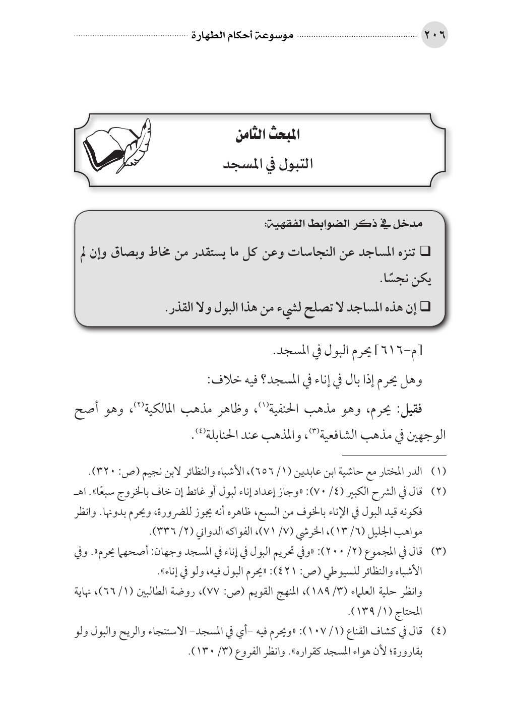 (¬٣) قال في المجموع (٢/ ٢٠٠): «وفي تحريم البول في إناء في المسجد وجهان: أصحهما يحرم». وفي الأشباه والنظائر للسيوطي (ص: ٤٢١): «يحرم البول فيه، ولو في إناء».